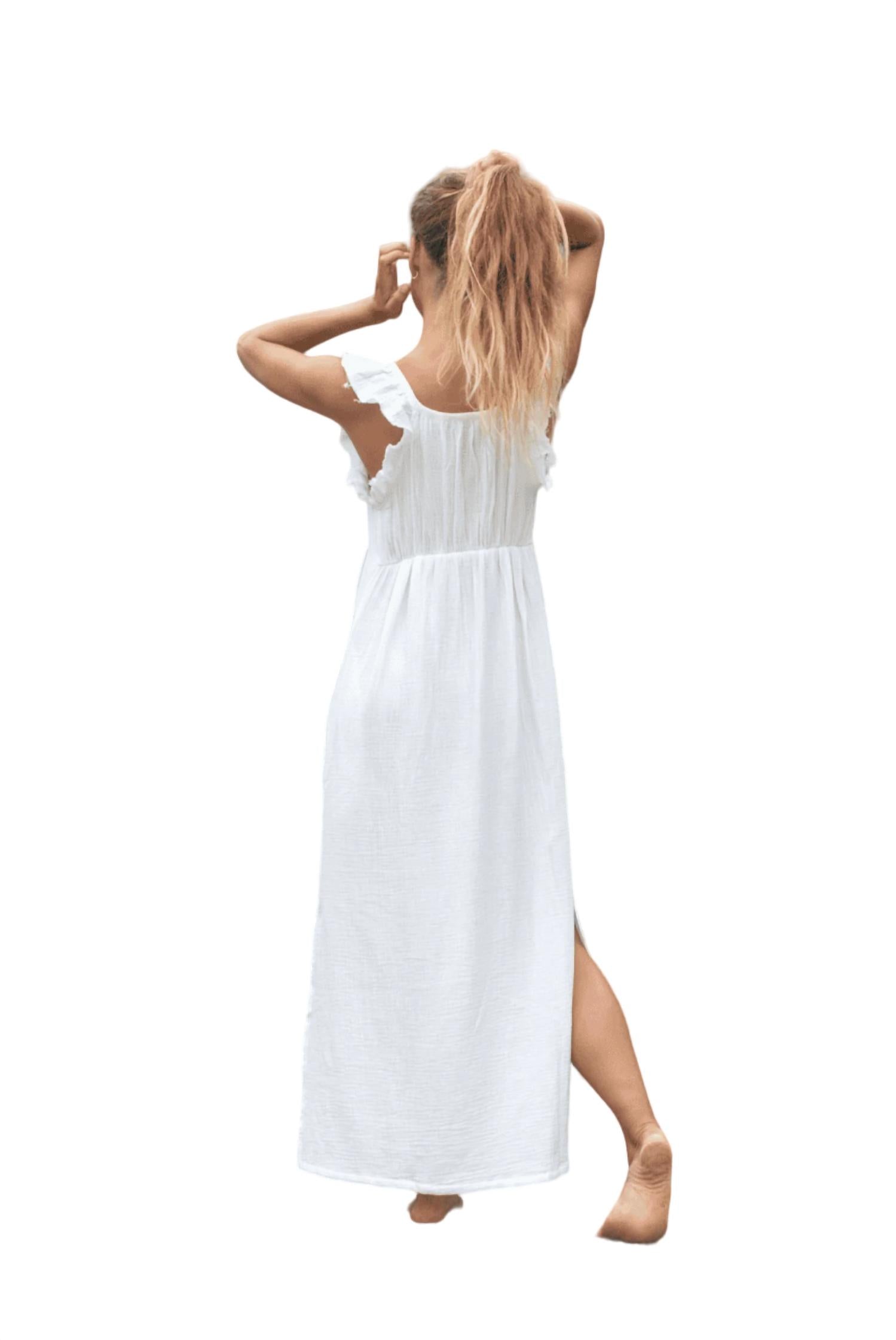 Длинный сарафан без рукавов с необработанным краем, оборкой на рукаве и завязкой-капелькой, овальным вырезом. Имеет свободный крой с женственной сборкой сзади на талии в стиле ампир.