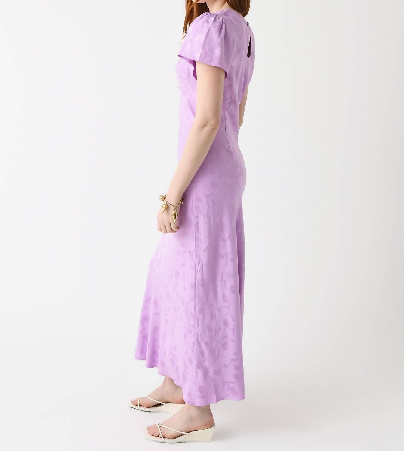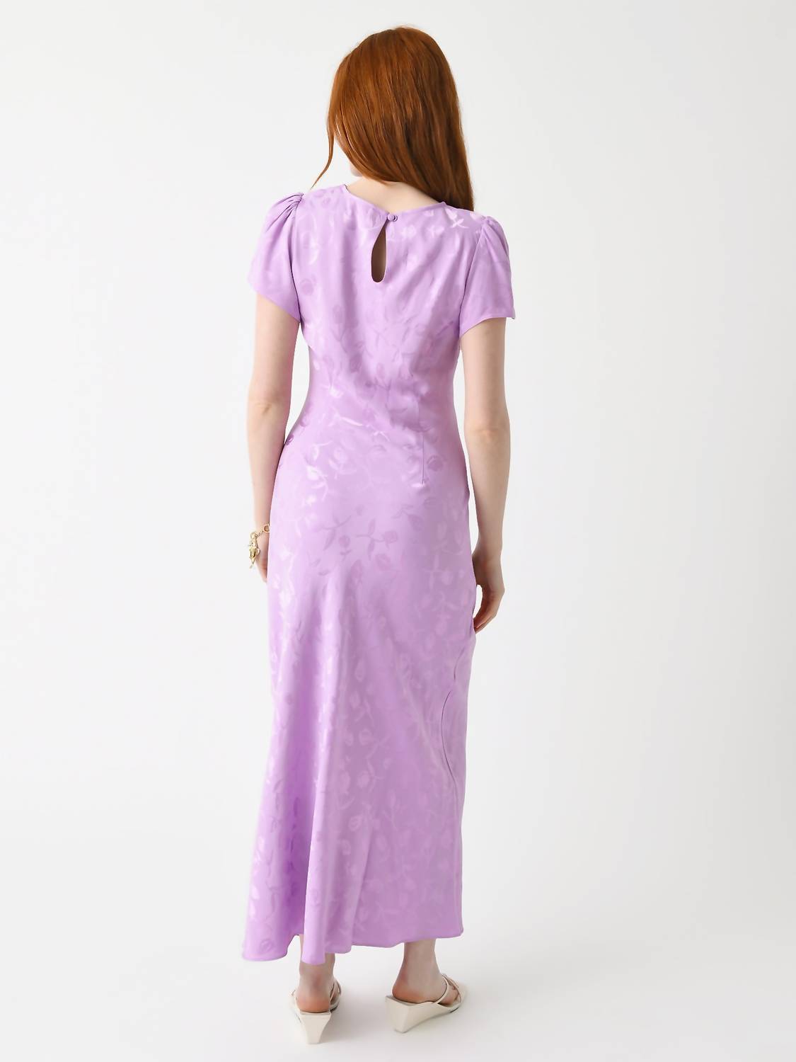 Круглый вырез. Застежка на пуговицы сзади. Рукава-крылышки. Юбка косого кроя. Силуэт макси. Жаккардовая ткань. 100% вискоза. Классический крой. На модели платье размера US 4/UK 8. Параметры модели: рост 5'8.5", бюст 32B, талия 26.5", бедра 35.5", размер платья 2 (US).