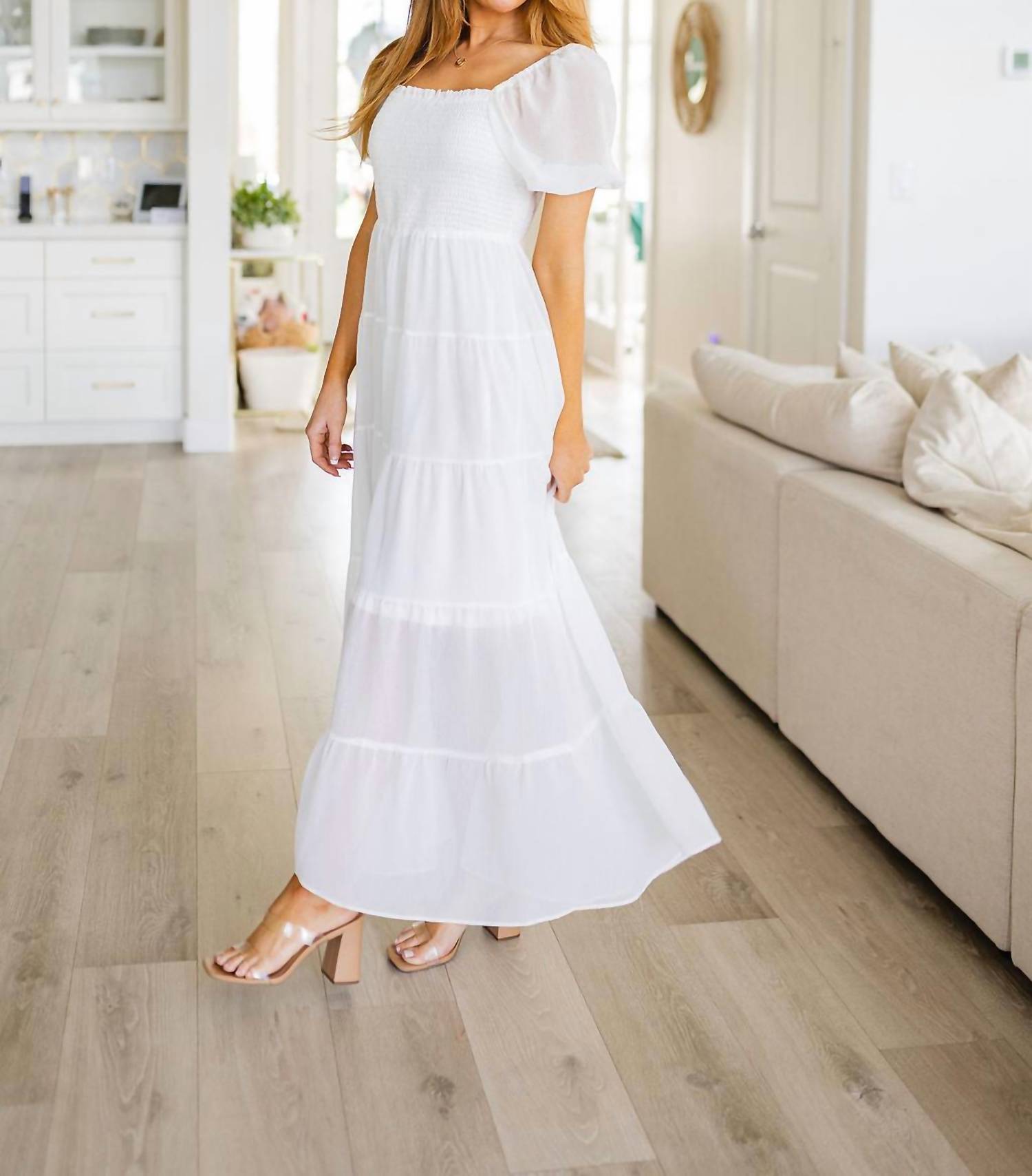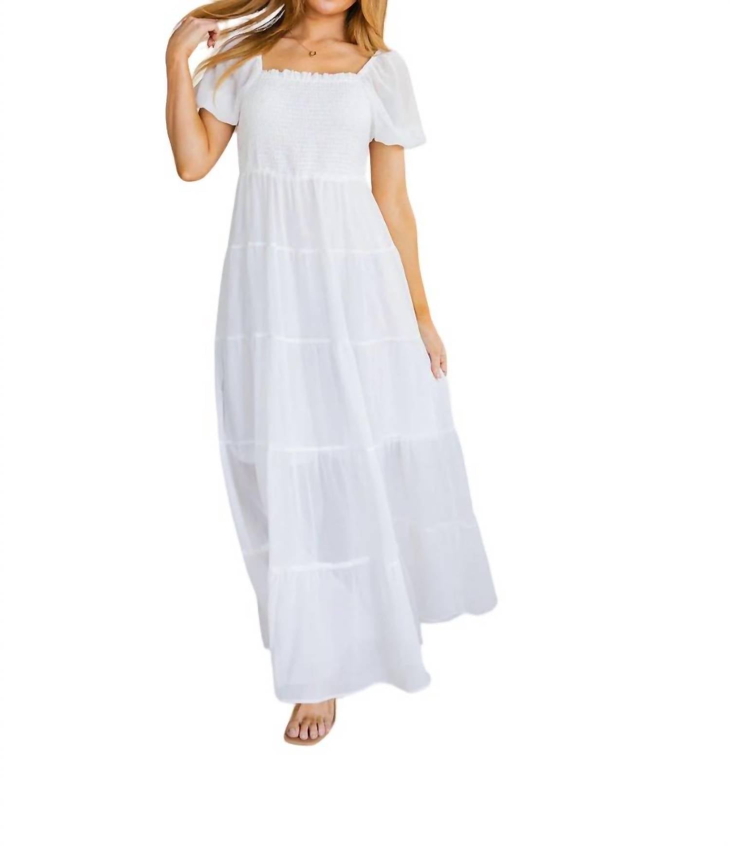 Легкая ткань. Квадратный вырез. Присборенный эластичный лиф. Многоярусная юбка. Полностью на подкладке. 95% полиэстер, 5% спандекс. Соответствует размеру.