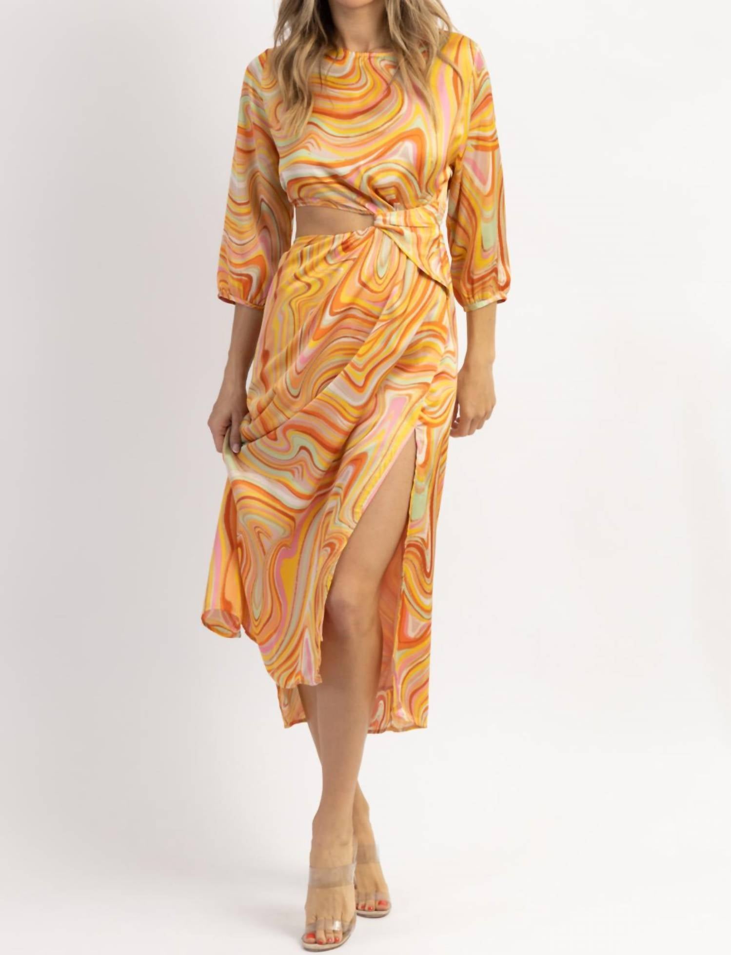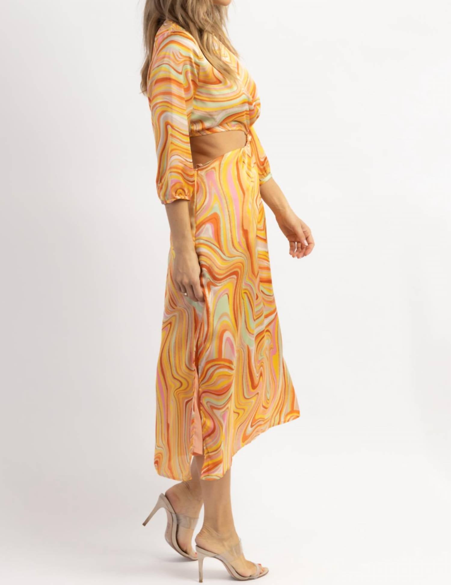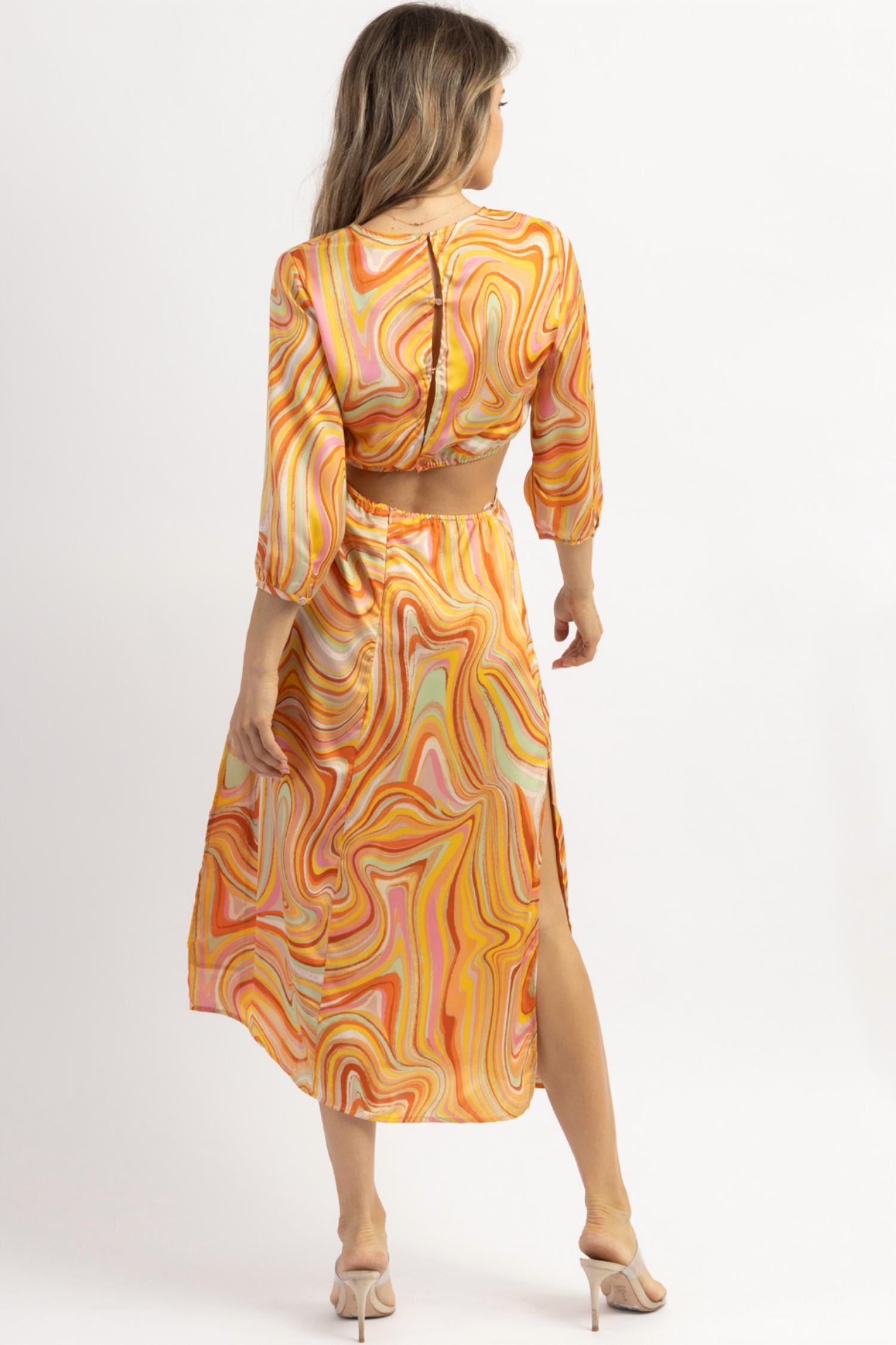 Открытая спина, открытые бока, разноцветный рисунок по всему изделию, шелковистый, длинные рукава. 100% полиэстер. На модели размер small. Рост 5'8. Размер платья 2.