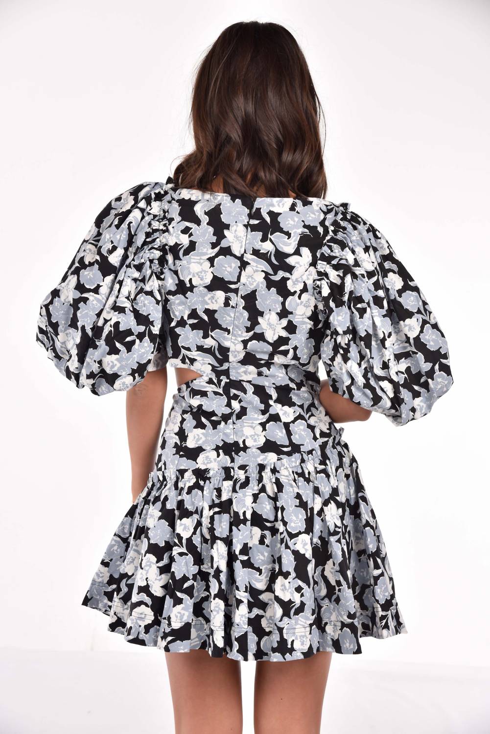 100% хлопок. Черно-синее платье с вырезами и цветочным принтом. Рукава-фонарики. Асимметричный подол с оборкой.