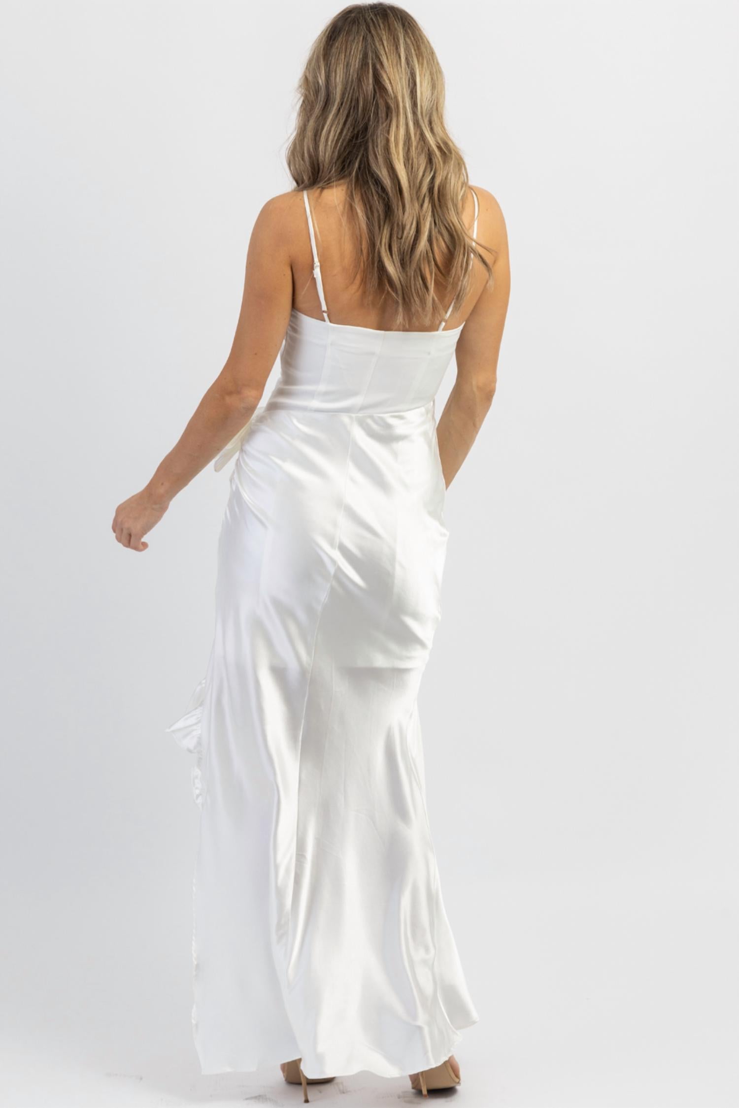 Прямой вырез, бретельки-спагетти, боковые оборки, длина макси, застежка-молния. 95% полиэстер, 5% спандекс. На модели размер small, рост 5'8, размер платья 2.