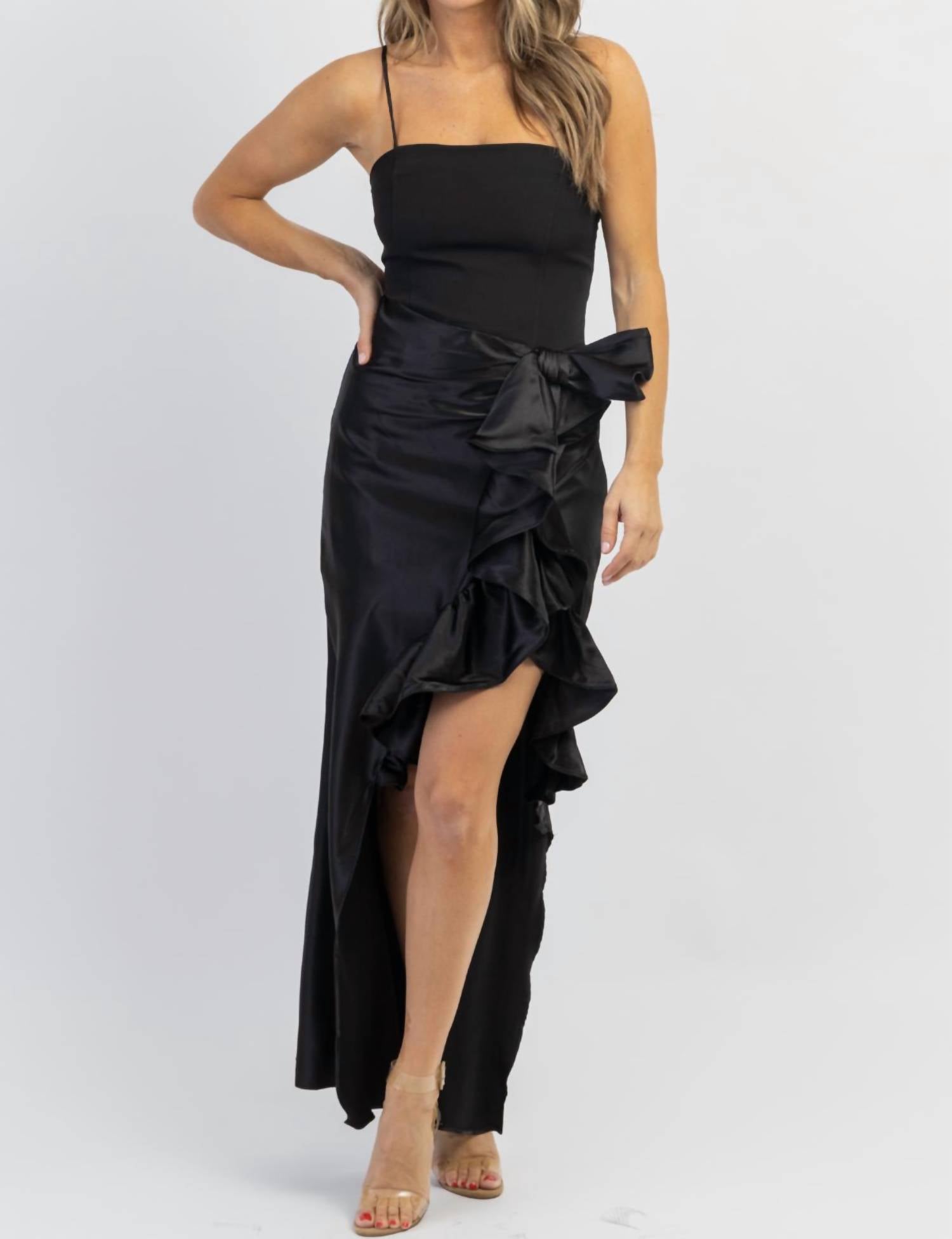 Прямой вырез, бретельки-спагетти, боковые оборки, длина макси, застежка-молния. 95% полиэстер, 5% спандекс. На модели размер small, рост 5'8, размер платья 2.