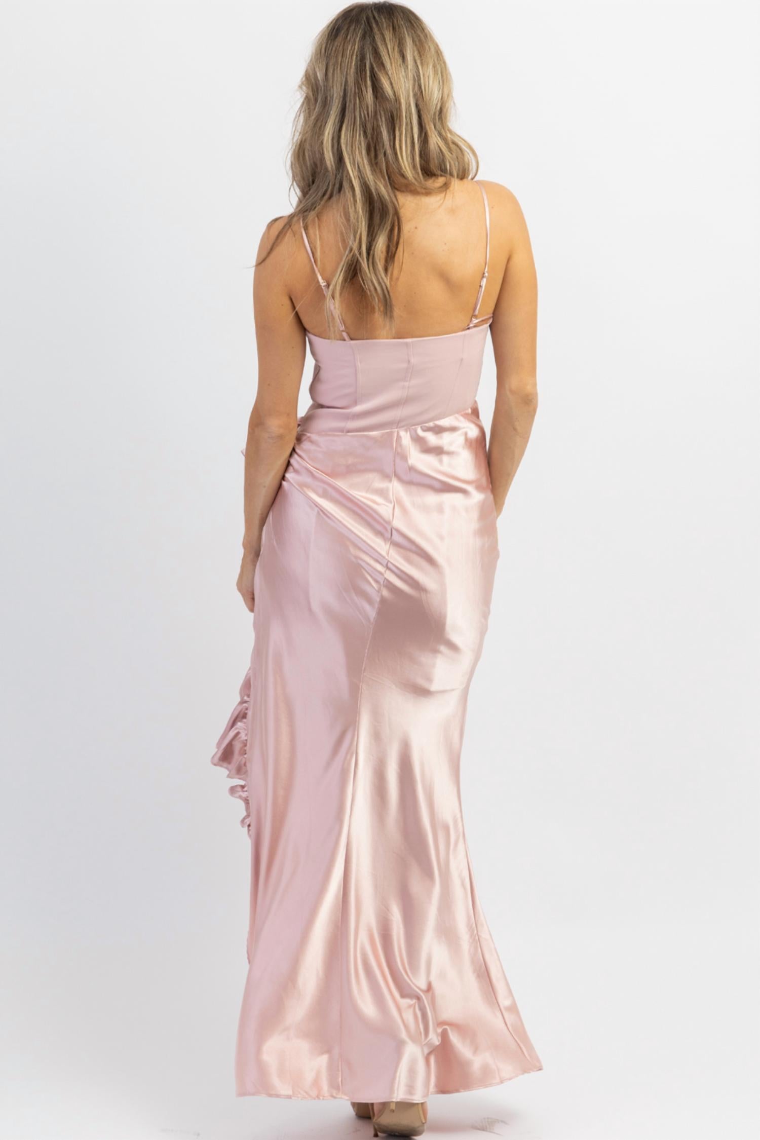 Прямой вырез, бретельки-спагетти, боковые оборки, длина макси, застежка-молния. 95% полиэстер, 5% спандекс. На модели размер small, рост 5'8, размер платья 2.