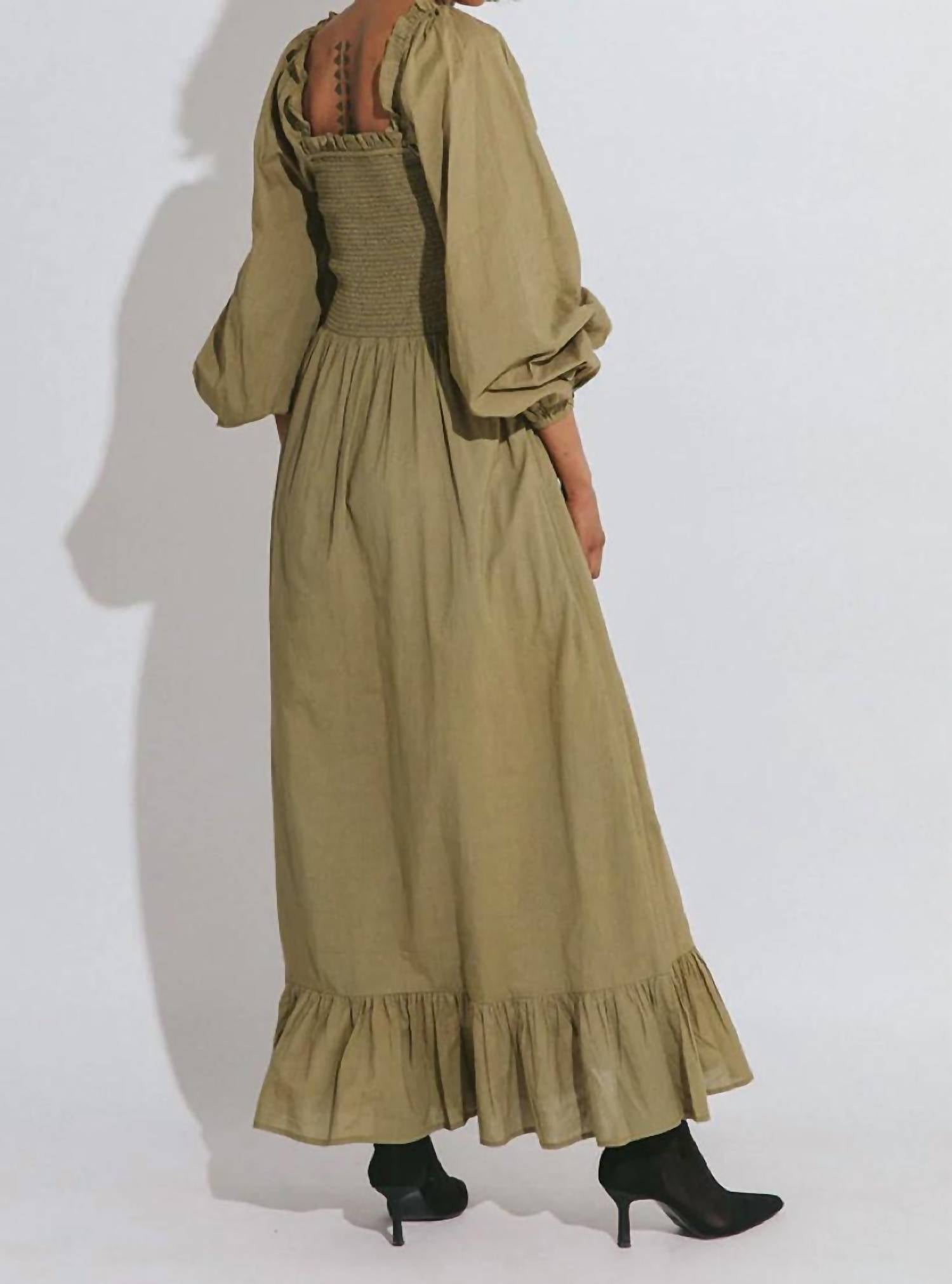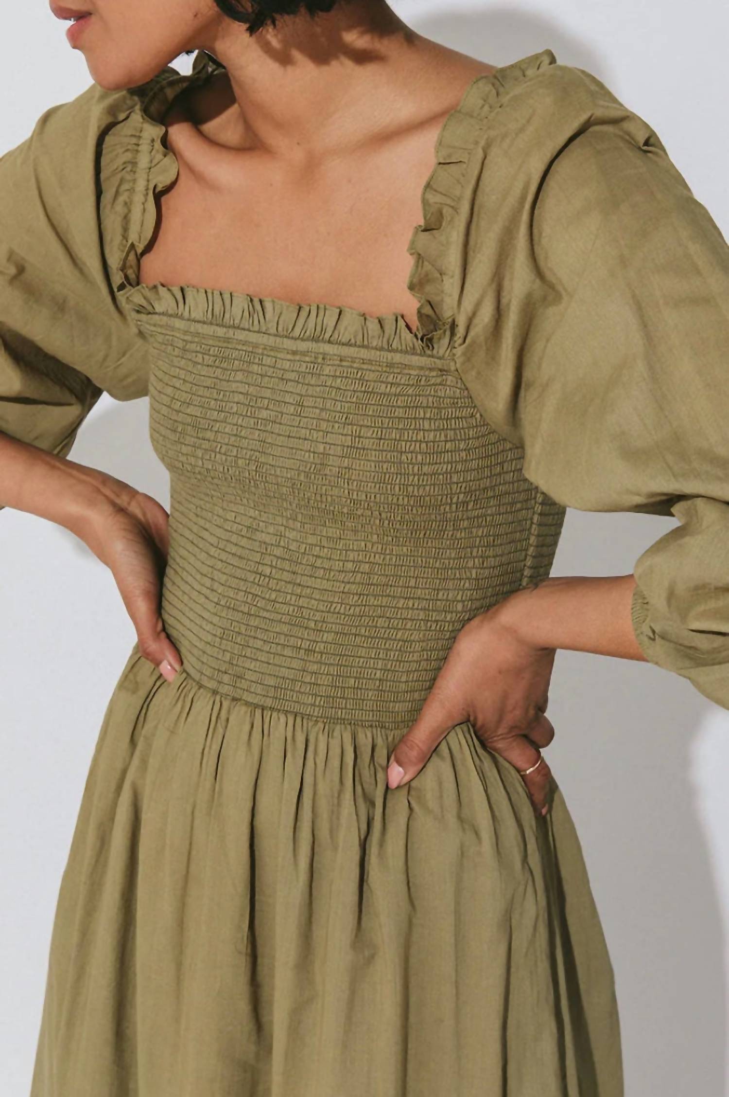 С облегающим присборенным лифом и забавными рукавами. Квадратный вырез с оборкой. Макси-длина. Изготовлено из 100% органического хлопка, сертифицированного GOTS.