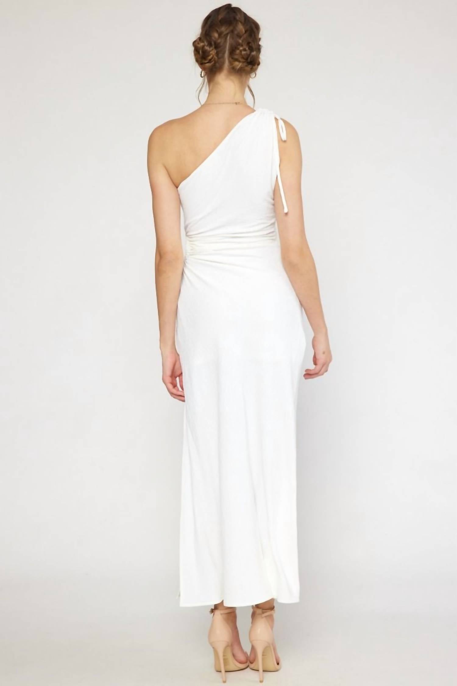 Потрясающее платье макси на одно плечо цвета белого с присборкой и открытым вырезом сбоку. Платье с сексуальным высоким разрезом сбоку и на подкладке. Отличное платье для выпускных, свадебных каникул и вечеринок. Тканое. Непрозрачное. Легкое. 100% полиэстер. Модель ростом 5 футов 10 дюймов, размер S.