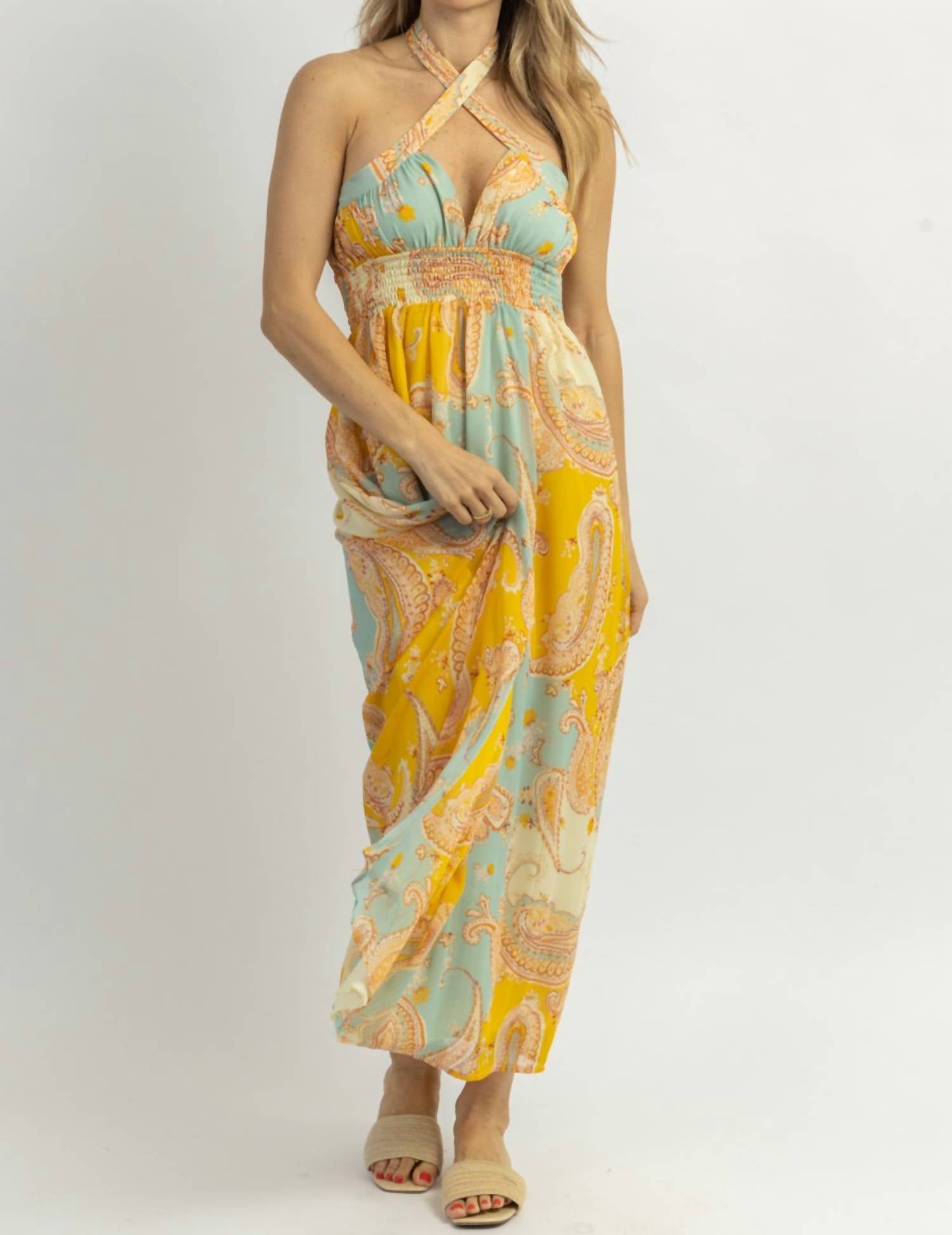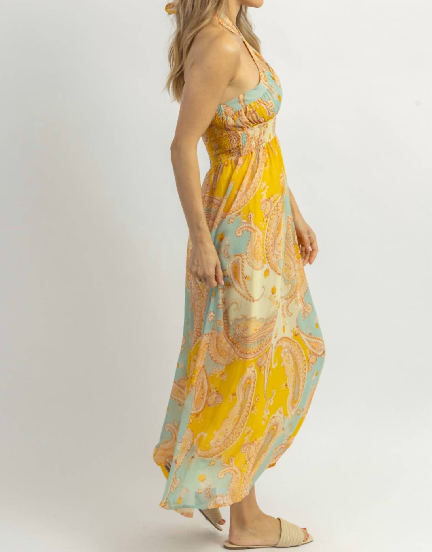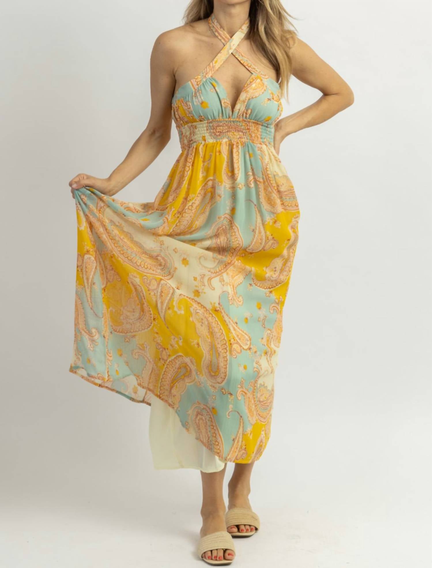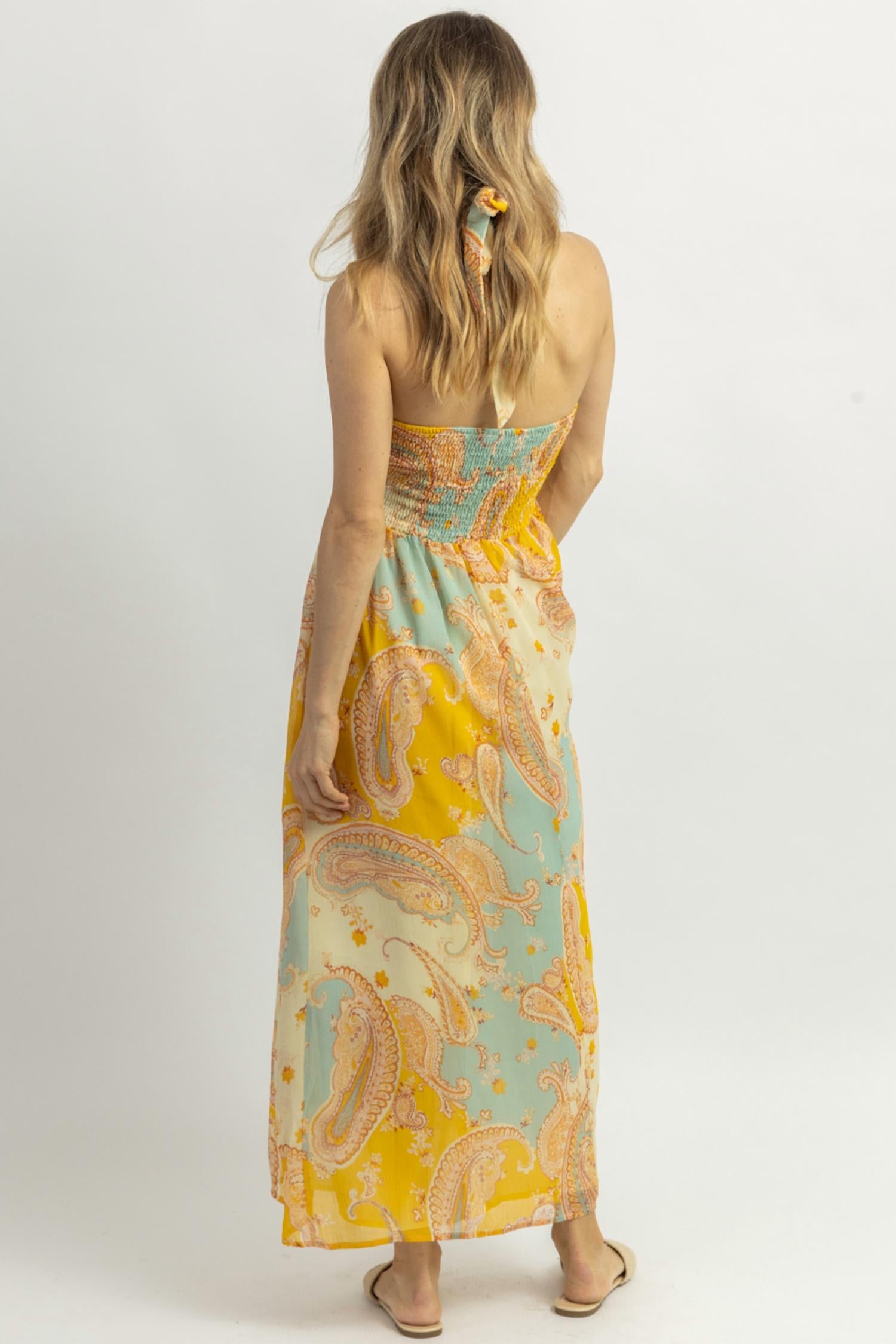 Без рукавов, завязывающийся халтер, на подкладке, узор по всему изделию, длина миди. 100% полиэстер. Рост модели 5'8, размер платья 2.