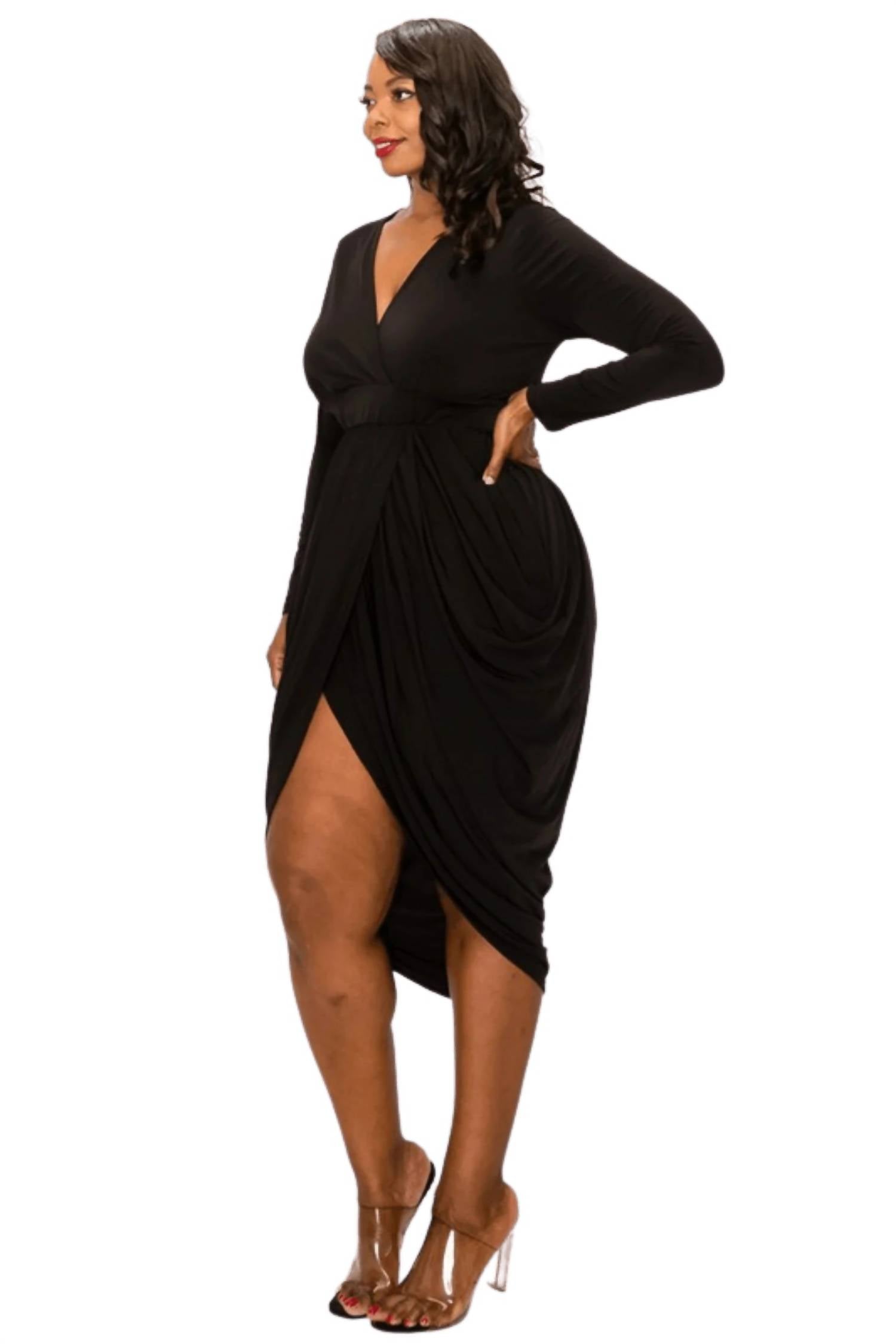 Платье-футляр с запахом. Длина миди с подолом-карандашом. Глубокий V-образный вырез. Длинные рукава. Высокая линия талии. Облегающий крой.