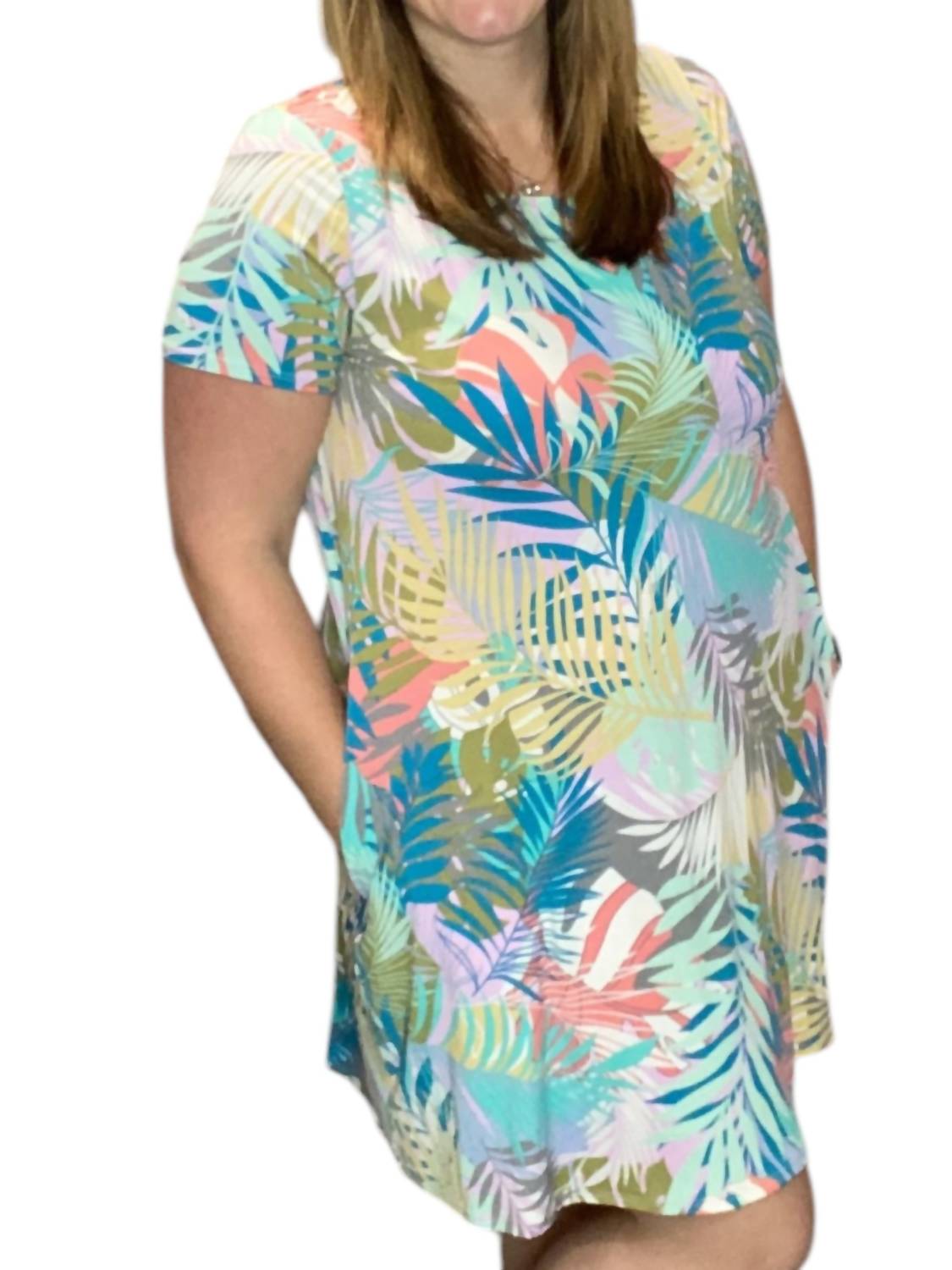 Принт с пальмовыми листьями. Короткие рукава. Платье длины миди. Вырез-лодочка. 100% хлопок. Машинная стирка в холодной воде.