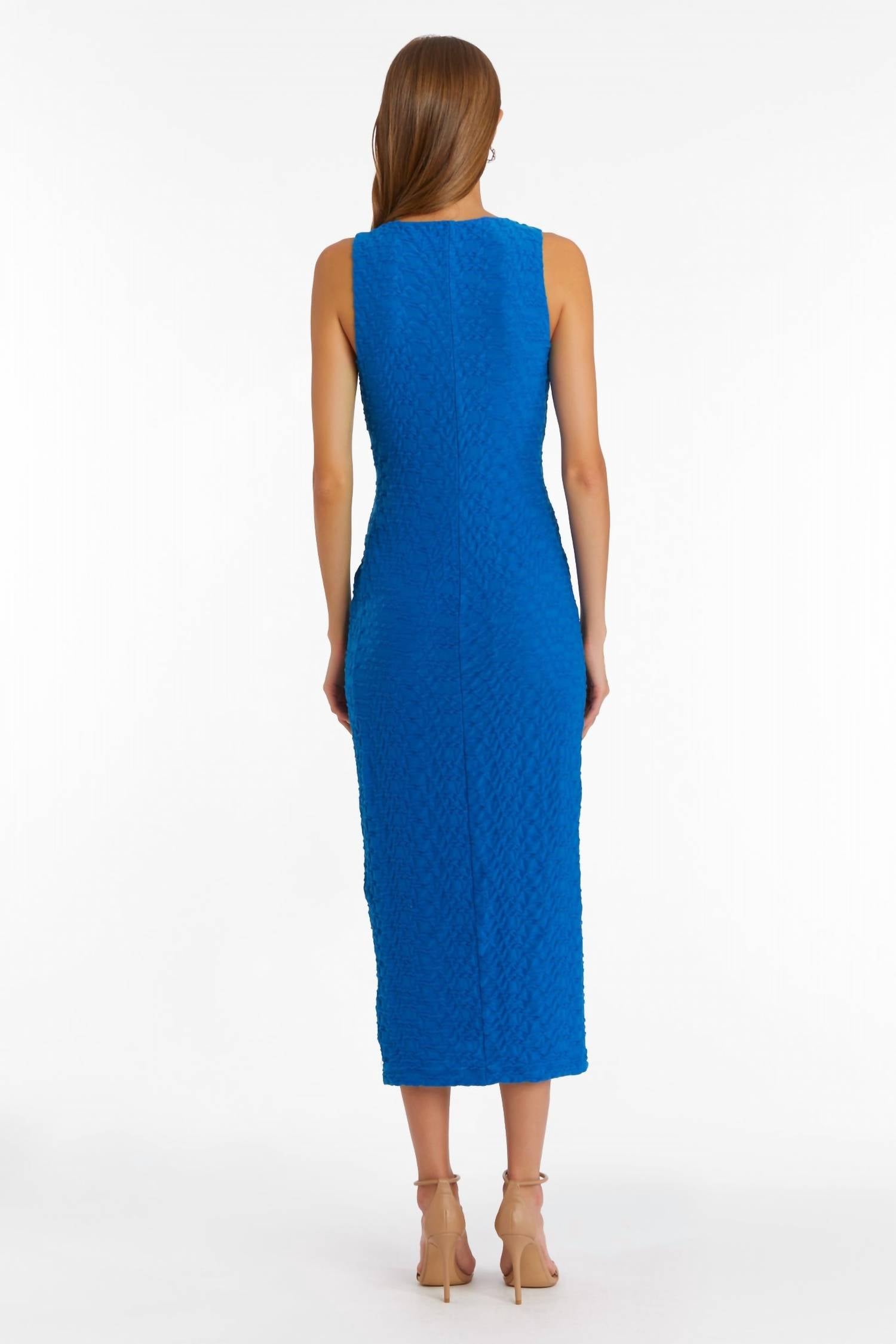 Это платье миди имеет облегающий силуэт bodycon, вырез-лодочка и безрукавный дизайн. Сделано с текстурным узором, включает застежку-липучку.