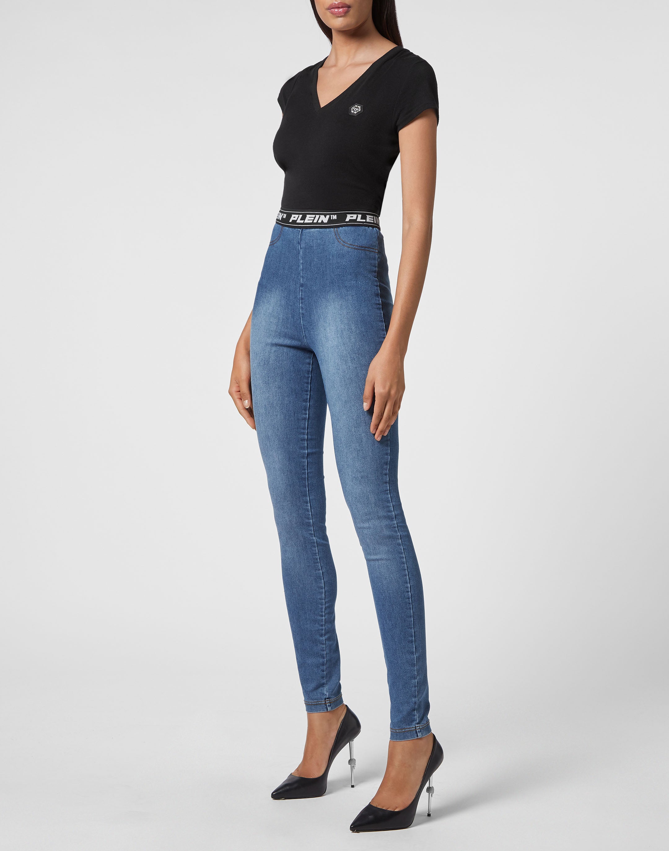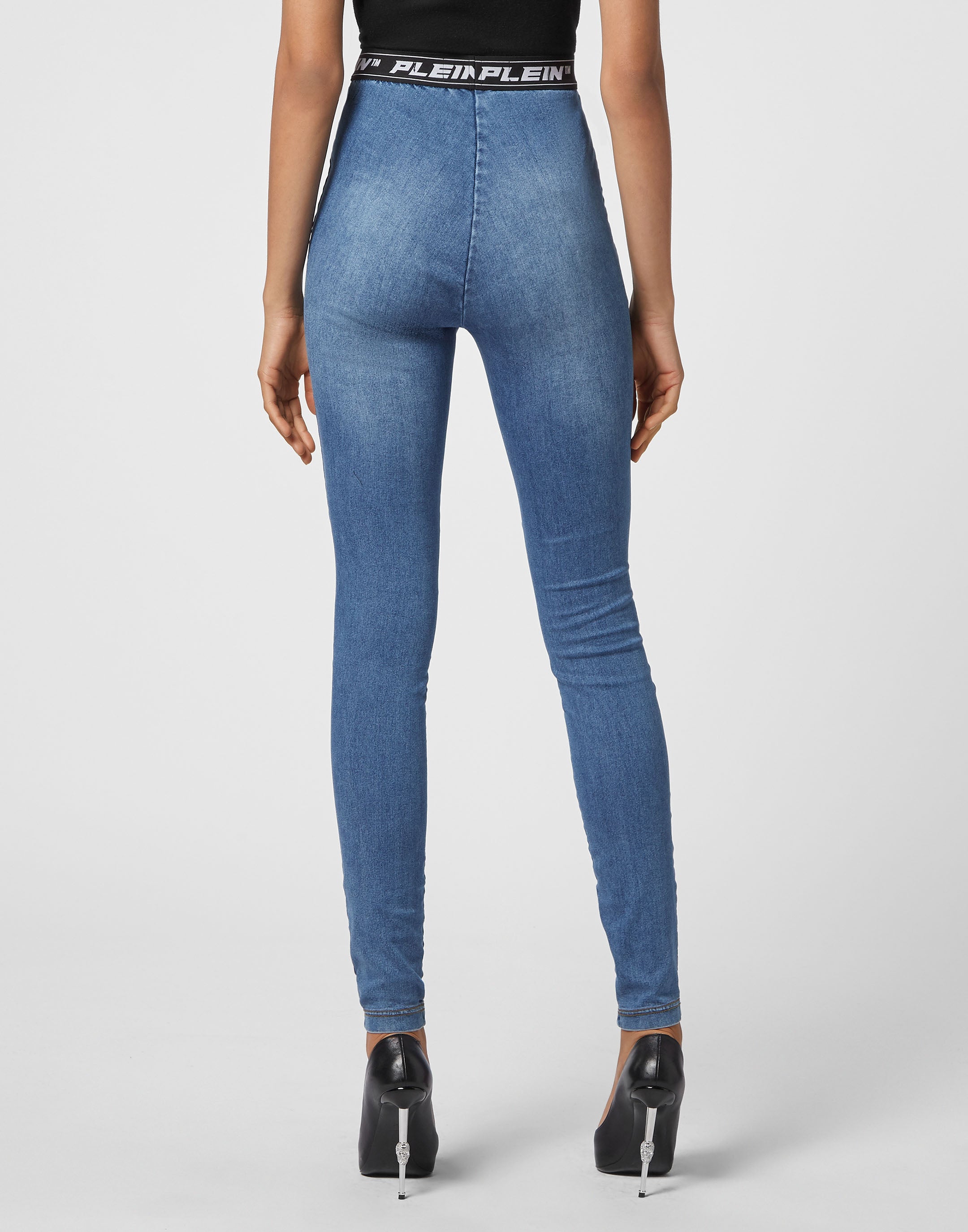 Леггинсы из суперэластичного денима Stone Wash с эластичным поясом, украшенным стразовыми надписями. Низ - 28 см. Посадка - Очень высокая талия.