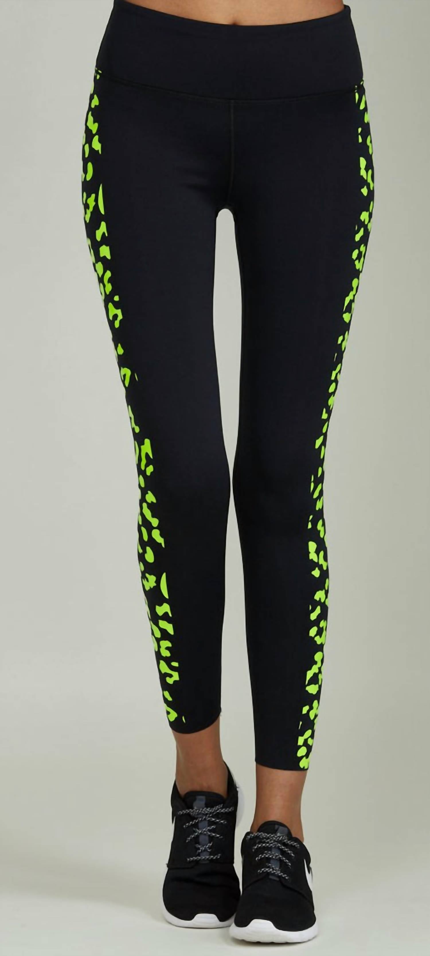 Спортивная неоновая леопардовая фольга каскадом спускается по бокам этих леггинсов.