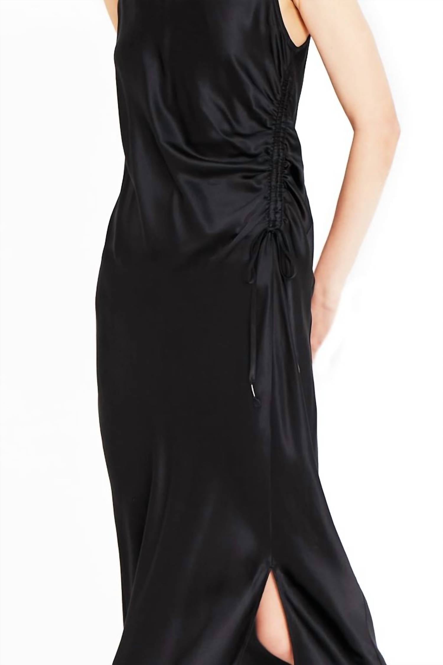 Ощутите элегантность с платьем Pull Me In Dress by Go by Go Silk, потрясающим черным платьем-миди, идеально подходящим для вечерних мероприятий. Это изделие без рукавов, изготовленное из 97% шелка и 3% спандекса, имеет вырез-драгоценность и прорезные проймы для элегантного стиля. Оно включает в себя боковые сборки, кулиску, боковой разрез и застежку-каплюв на пуговицу, длина 53". Ручная стирка для сохранения его роскошного качества.
