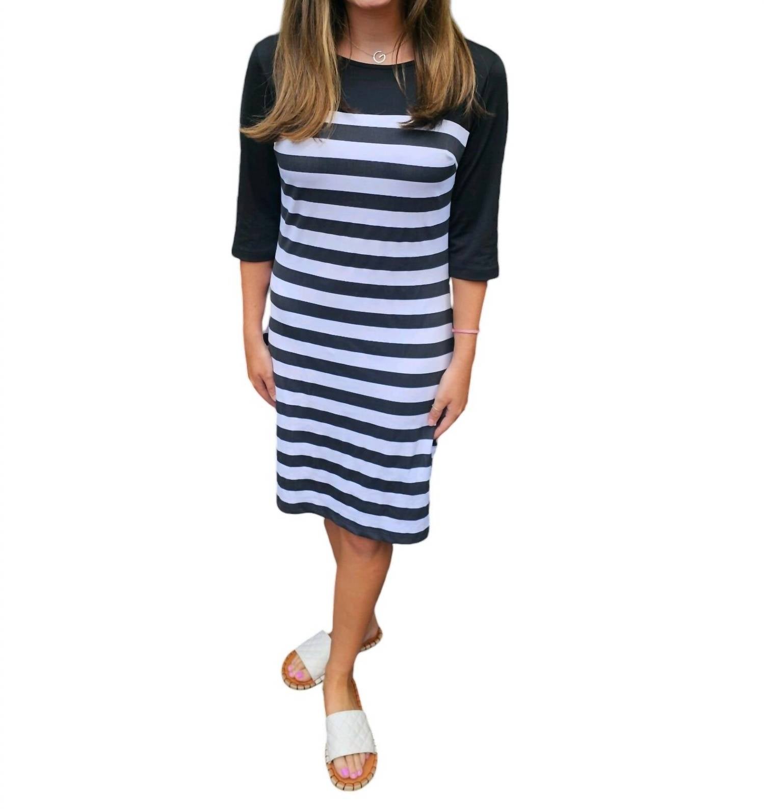 Легкое и выгодное платье, которое вы будете носить весь сезон. Это платье с круглым вырезом, длиной до колена и рукавами три четверти. Оно изготовлено из смеси полиэстера и спандекса с полосатым принтом для удобной и эластичной посадки. Машинная стирка в холодной воде. Оно маломерит, поэтому подумайте о том, чтобы взять на размер больше, чтобы лучше подошло.