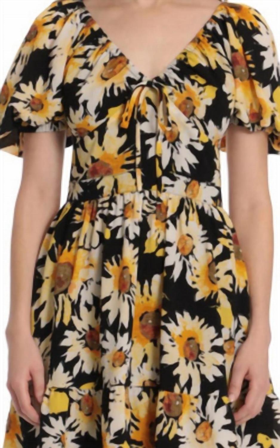 Легкое и подчеркивающее фигуру платье, которое вы будете носить в течение всего сезона. Мини-платье с принтом подсолнухов, лифом с рюшами, рукавами-фонариками и карманами.