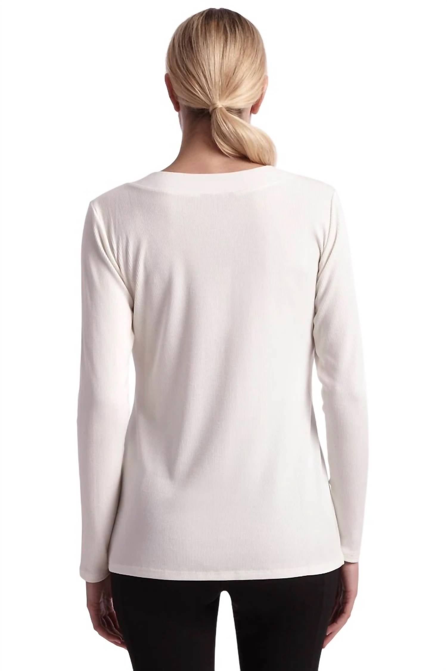 Футболка с V-образным вырезом. 94% полиэстер, 6% спандекс. Машинная стирка в холодной воде, не отбеливать, сушить в разложенном виде, гладить при низкой температуре при необходимости или чистить в химчистке. Импортная. Текстурная трикотажная конструкция. Длинные рукава. Прямой подол. Модель надевается.