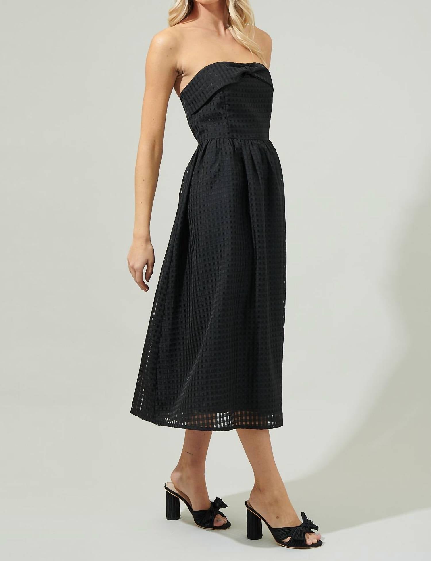 Отличается кокетливым вырезом без бретелек со скрытыми нескользящими полосками и объемной деталью в виде банта, которая подчеркивает облегающий лиф. Без рукавов. Бант на груди. На подкладке. Рост модели 5 футов 8 дюймов, размер XS. Мерки указаны для размера S: обхват груди — 16 3/4 дюйма, длина — 41 дюйм. Материал — 100% полиэстер; подкладка — 97% полиэстер, 3% спандекс. Номер модели STD13969.
