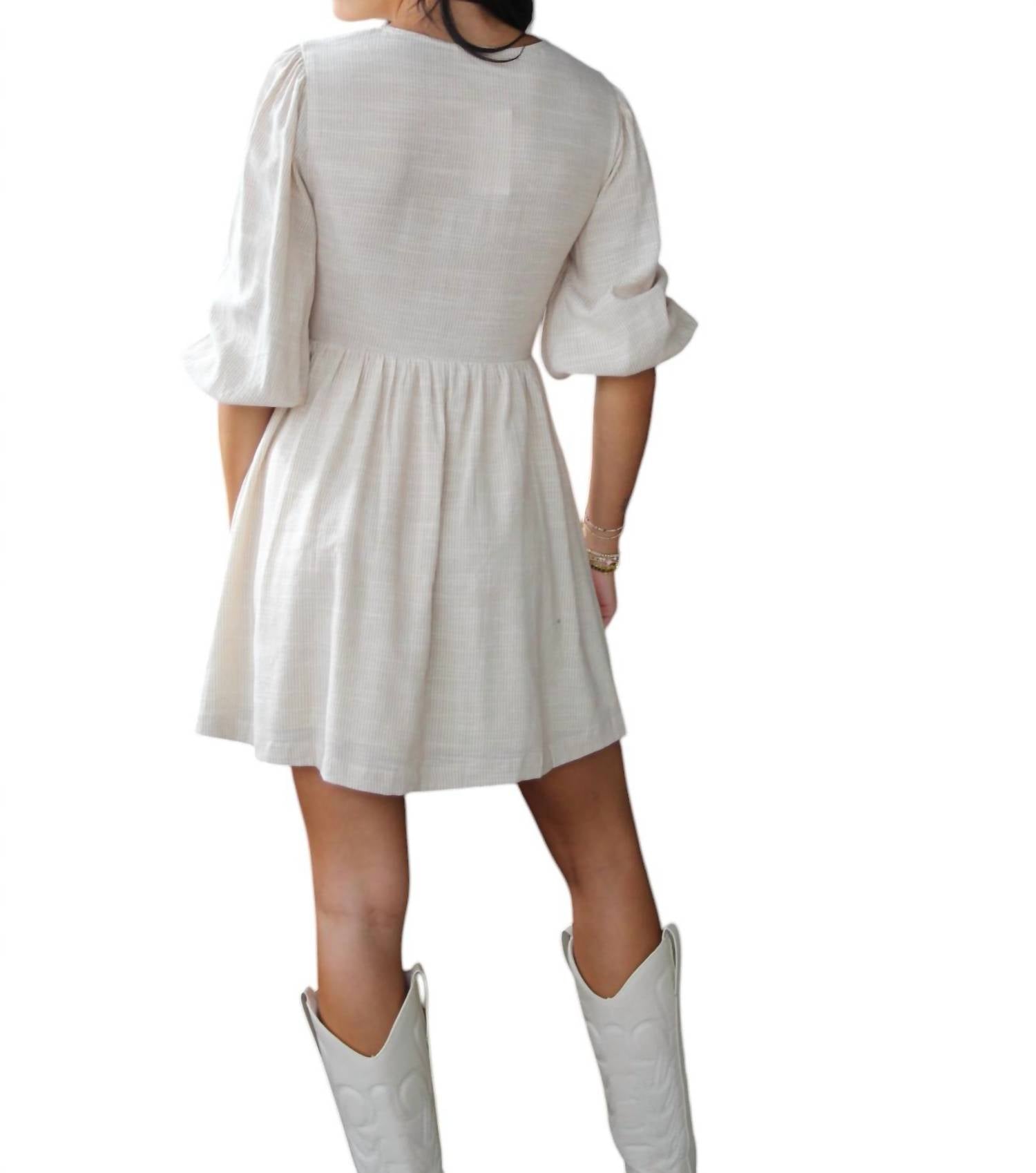Это мини-платье Pin Stripe Bow с текстурированным узором в тонкую полоску, присборенной талией и силуэтом А-силуэта с боковыми карманами и рукавами три четверти. Спроектированное с круглым вырезом и завязкой, оно предлагает элегантный и игривый вид.