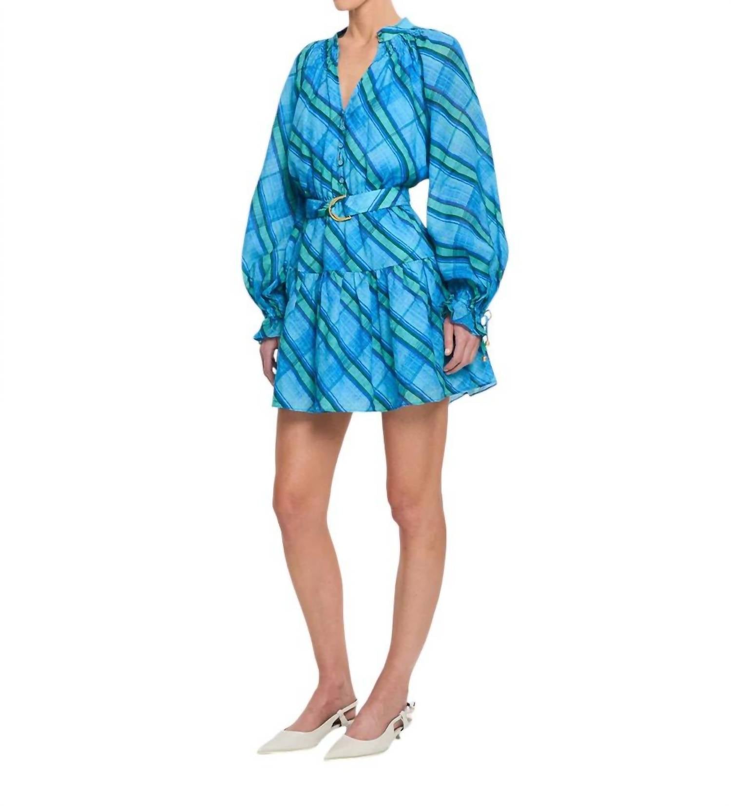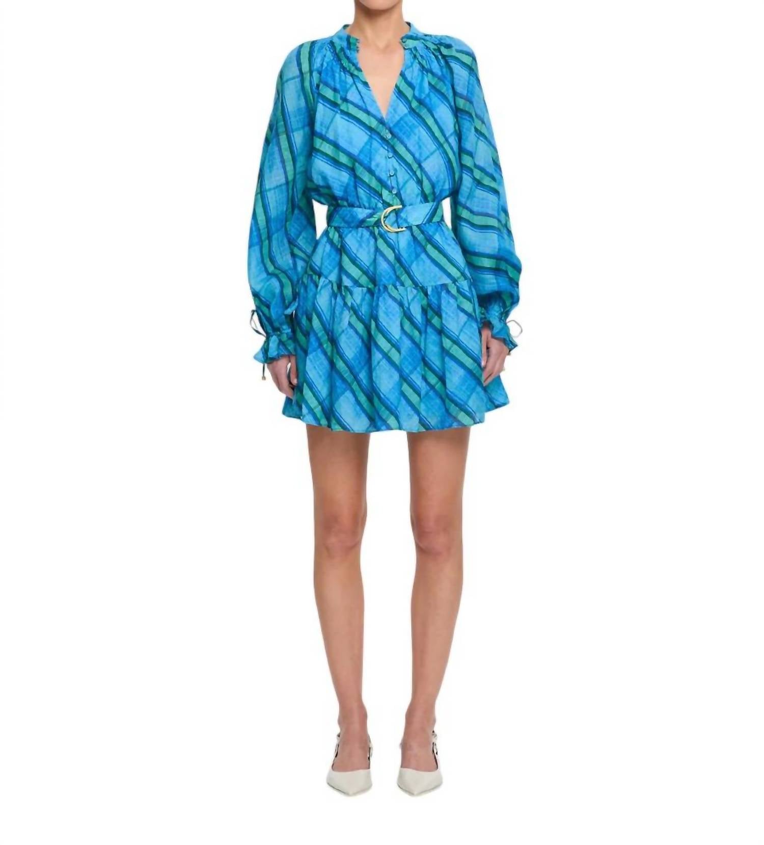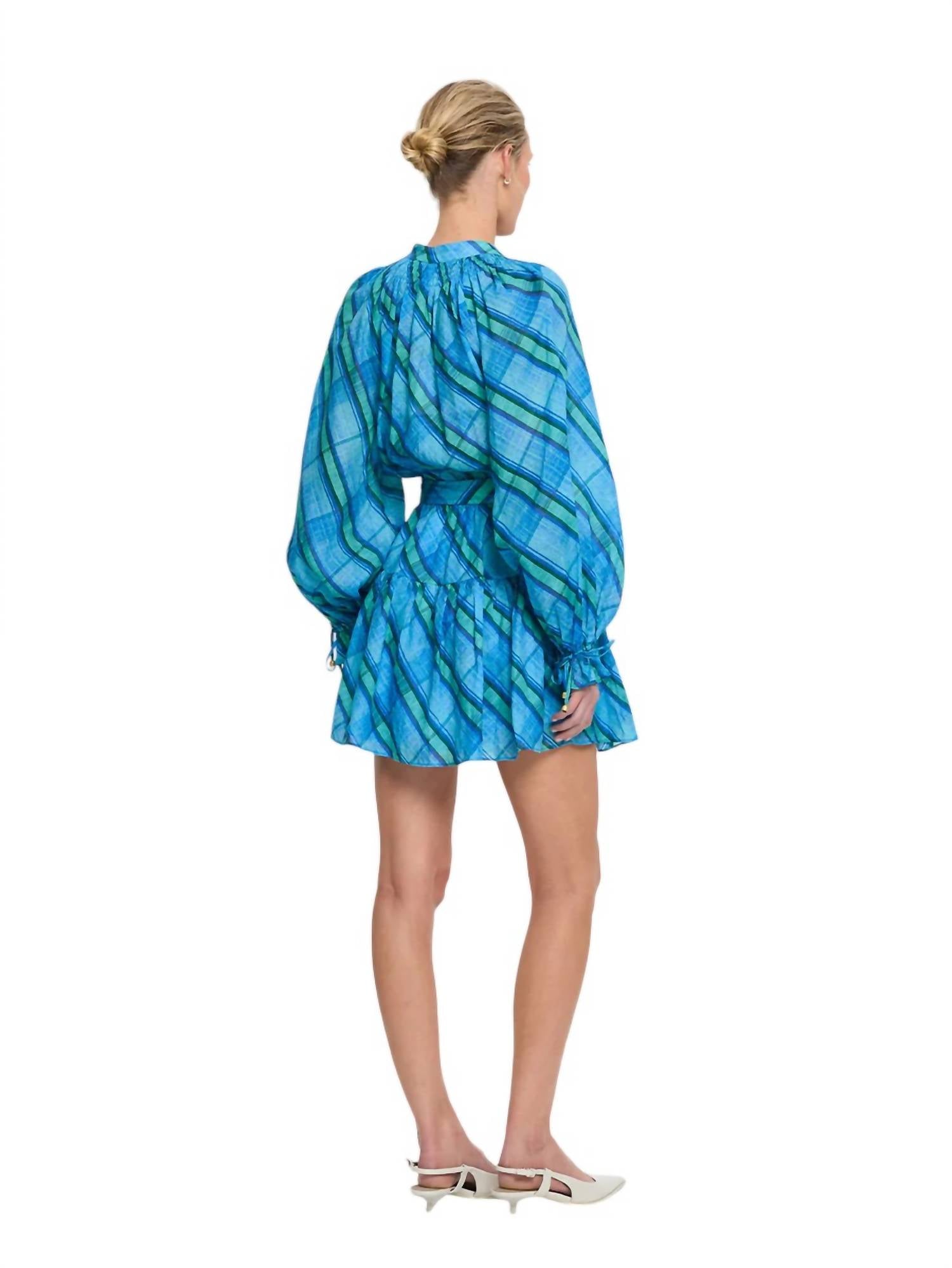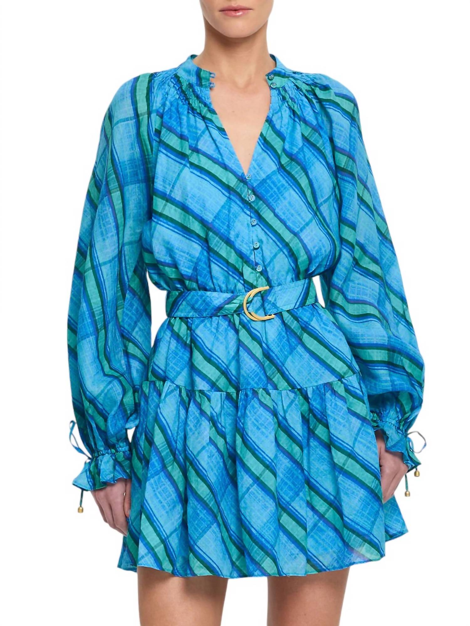 Это мини-платье имеет воротник-стойку, сборку на шее и застежку на пуговицы спереди. Рукава реглан с эластичными манжетами и оборками, эластичную талию и съемный пояс с D-образным кольцом. Изготовлено из 100% рами, размер соответствует.