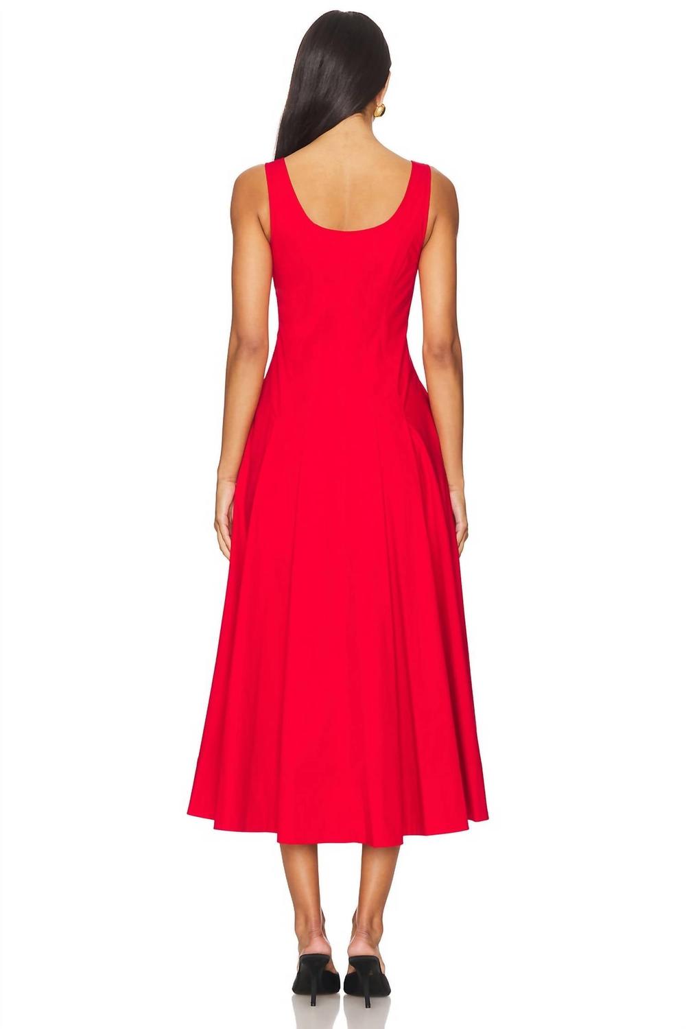 Это платье миди с глубоким вырезом, мягкой складкой и швами, подчеркивающими естественные изгибы тела. Оно имеет скрытую застежку-молнию сбоку, карманы в боковых швах и полностью на подкладке. Изготовлено из 96% хлопка и 4% эластана. Только сухая чистка. Рост модели 5 футов 9 дюймов, на ней размер 2. Длина плечевого шва до подола составляет приблизительно 49,6 дюйма (126 см). Сделано во Вьетнаме.