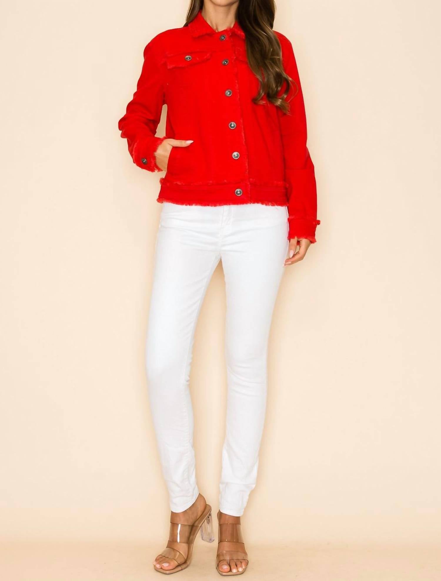 Повседневная, но классная куртка, которая нужна в каждом гардеробе. Представляем куртку Sequin Heart от WAY, яркое дополнение к вашей повседневной коллекции. Эта красная куртка из хлопкового твила с длинными рукавами изготовлена ​​из 97% хлопка и 3% спандекса, обеспечивая удобную посадку. Она имеет застежку на пуговицы, стильный воротник, детали с потертой бахромой и большое сердце из пайеток на спине. Эта куртка, доступная в размерах от XS до L, идеально подходит для добавления сверкающего штриха к любому наряду.