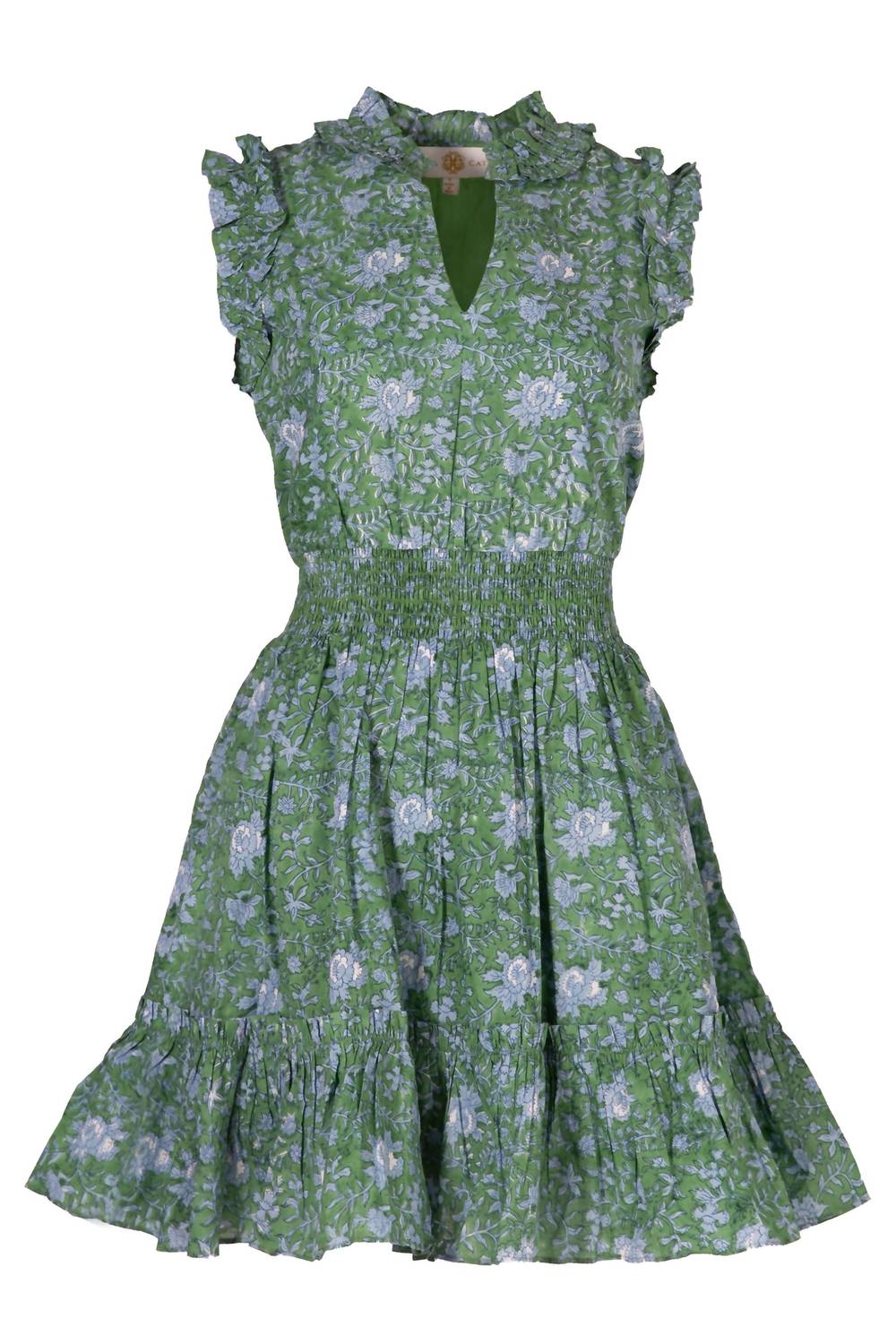 Это платье — мини, выполненное из мягкого, дышащего хлопка с цветочным принтом. Имеет воротник-стойку с оборкой, V-образный вырез и рукава-крылышки с оборками. Присборенная талия стягивается, переходя в летящую юбку, доходящую до середины бедра. Идеально подходит для повседневных или нарядных случаев.