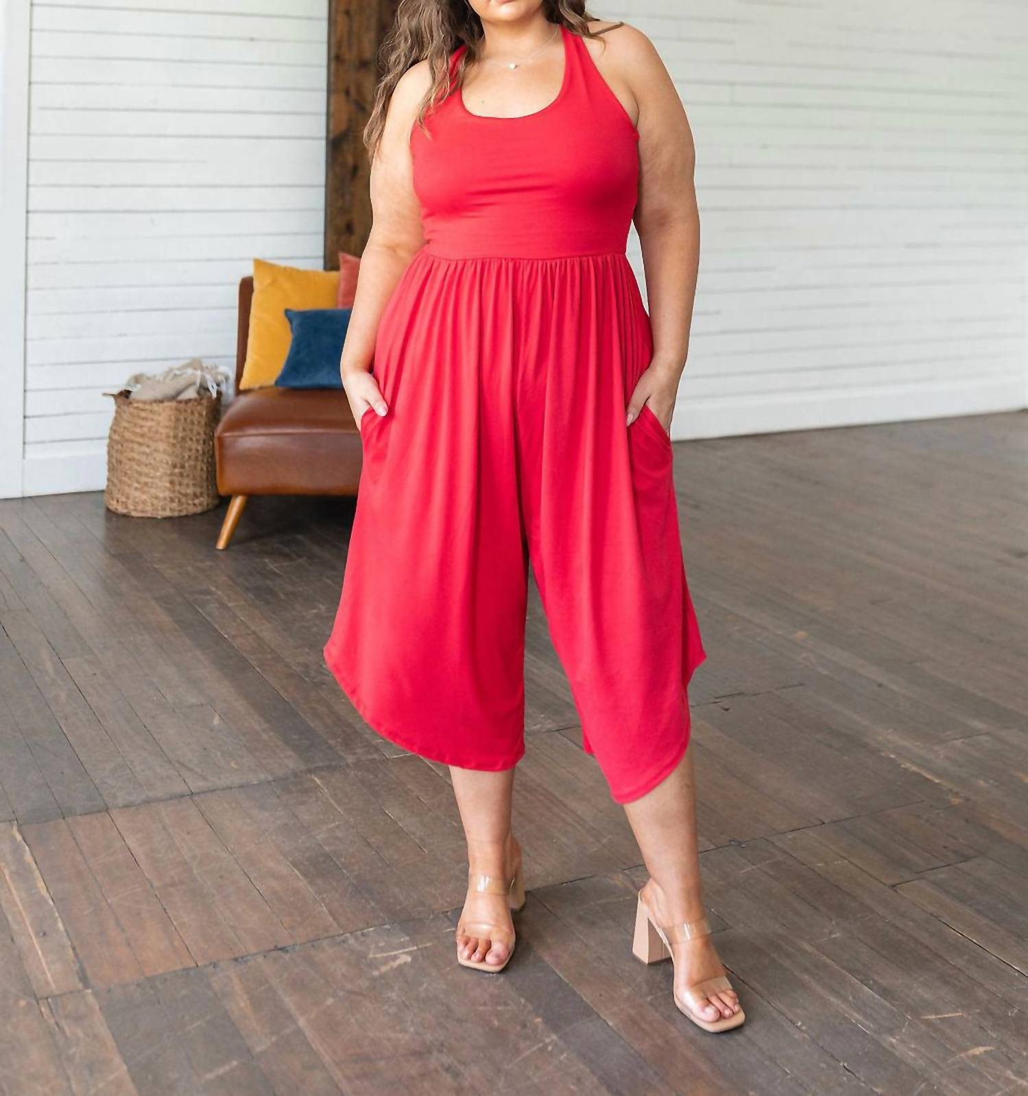 Вырез горловины «лодочка». Приталенный лиф. Штаны-шаровары. Трикотаж «джерси». Широкие перекрещивающиеся бретели. Открытая спина. Съемные подушечки. Эластичный пояс. Карманы. 95% полиэстер, 5% спандекс. Большемерит, на размер меньше.