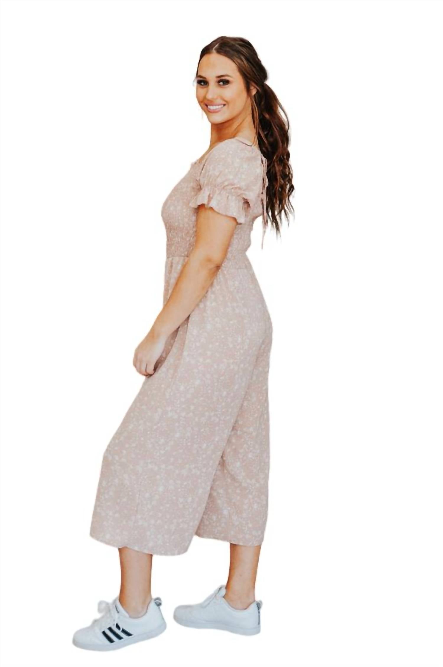 Комбинезон с цветочным принтом, удобный дизайн. Сборка сверху и струящийся низ. Легко носить и укладывать. Стирать при 30 градусах, не отбеливать и не сушить в стиральной машине, гладить в прохладной воде с изнанки, стирать с вещами похожих цветов, развешивать после стирки.