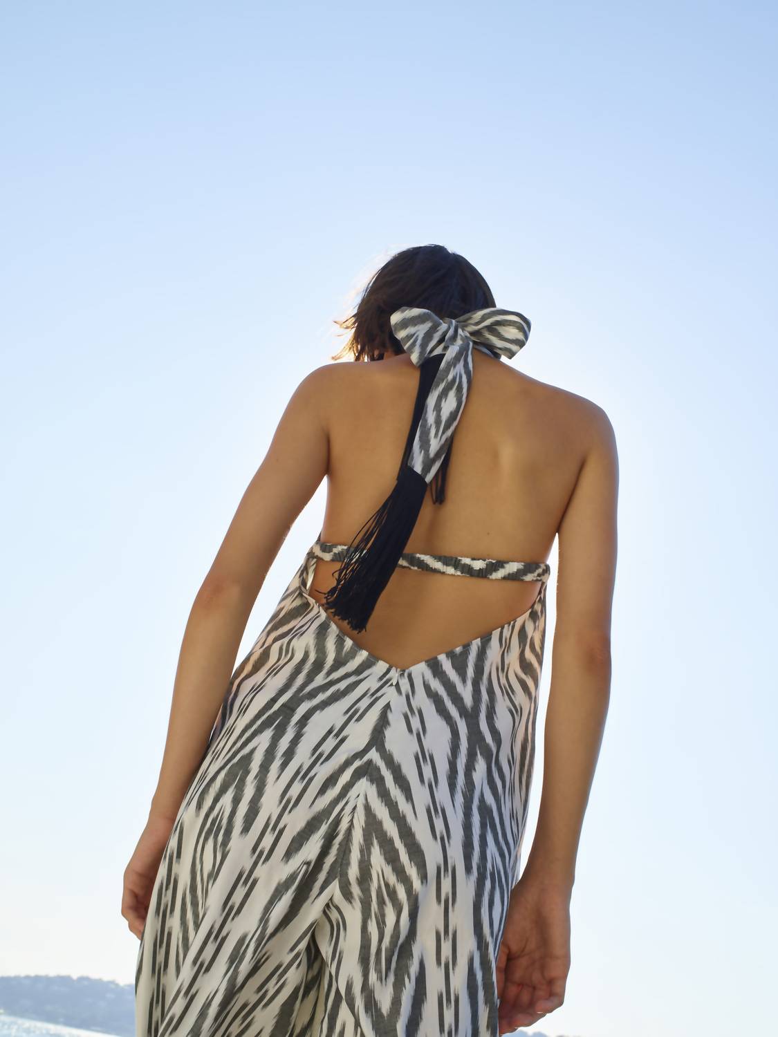 Хлопковый икат ручной работы. Ткань - 100% хлопок икат. Размер модели 180 см, бюст 80 см, талия 63 см, бедра 90 см. На модели размер S. Комбинезон с открытой спиной.