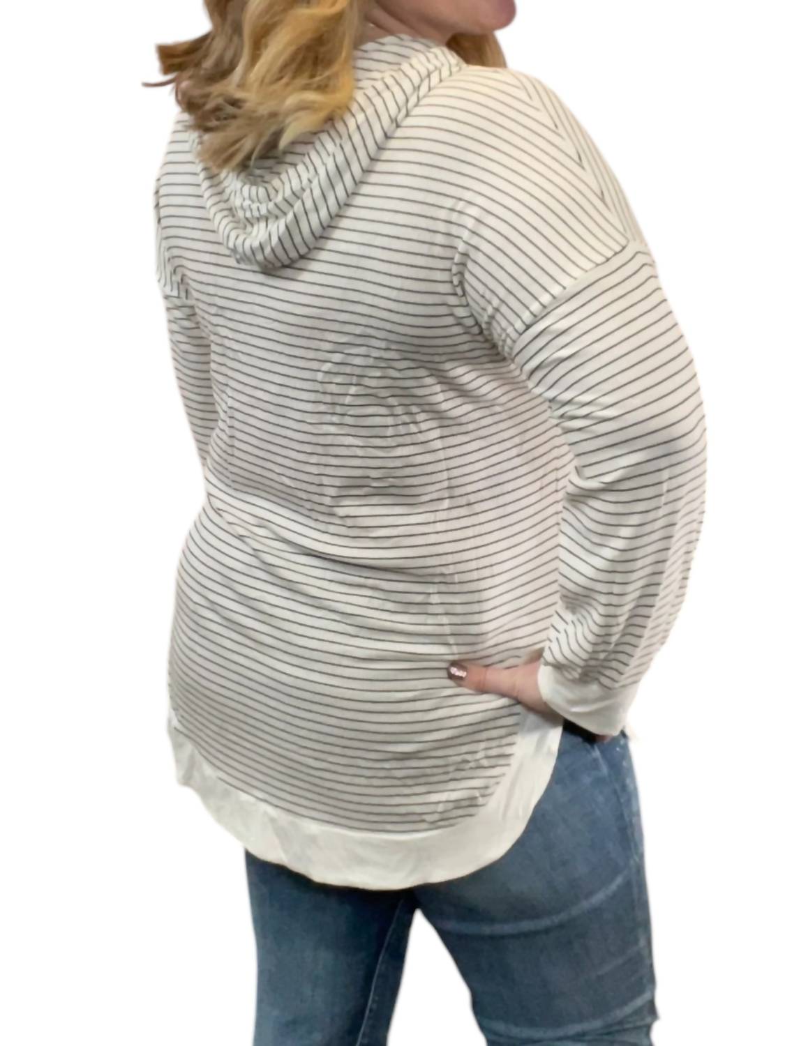 Капюшон на шнурке. Длинные рукава. Полосатый рисунок. Фестончатый подол. 80% вискоза, 15% полиэстер, 5% спандекс.