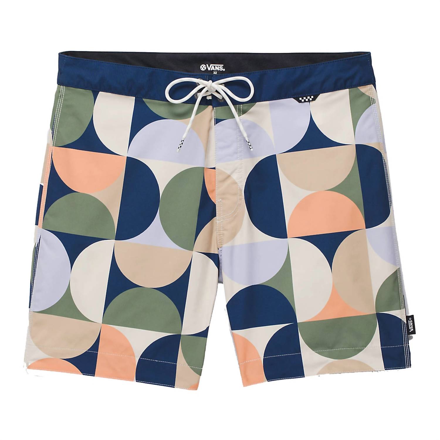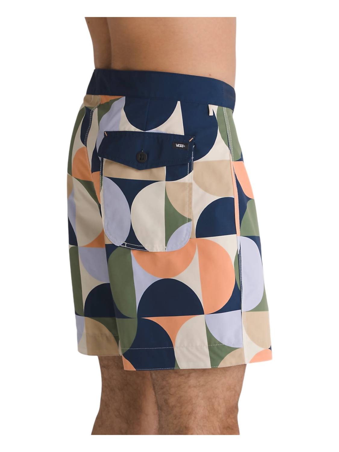 Механическая эластичная конструкция в 2 направлениях. Геометрический принт по всей поверхности. Скрытый крючок за шнурком на ширинке. Правый накладной карман с застежкой на пуговицу. Шахматная петля для солнцезащитных очков на поясе. Петля для ключей на поясе сзади. Тканый флажок Vans на боковом шве. Внешний шов — 17 дюймов. Водонепроницаемый. Ткань из 100% переработанного полиэстера.