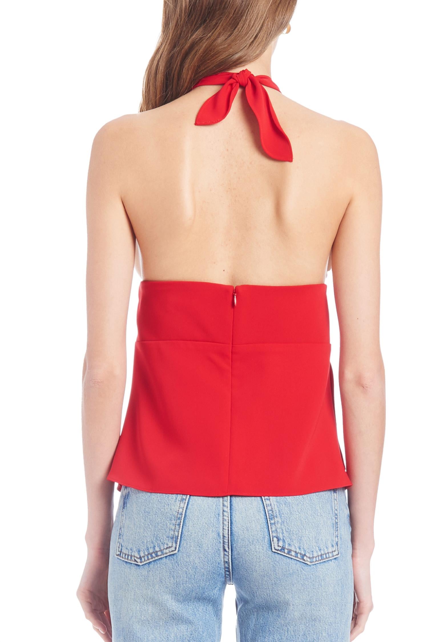 Красный топ-халтер с перекрестными передними бретелями и оборками. Отлично смотрится с джинсами, заправленными внутрь или вывернутыми наружу. 100% полиэстер. Цвет - алый. Отделка оборками. Скрытая застежка-молния сзади. Застежка-халтер на шее. Нескользящая силиконовая накладка сзади. Машинная стирка. Сделано в США