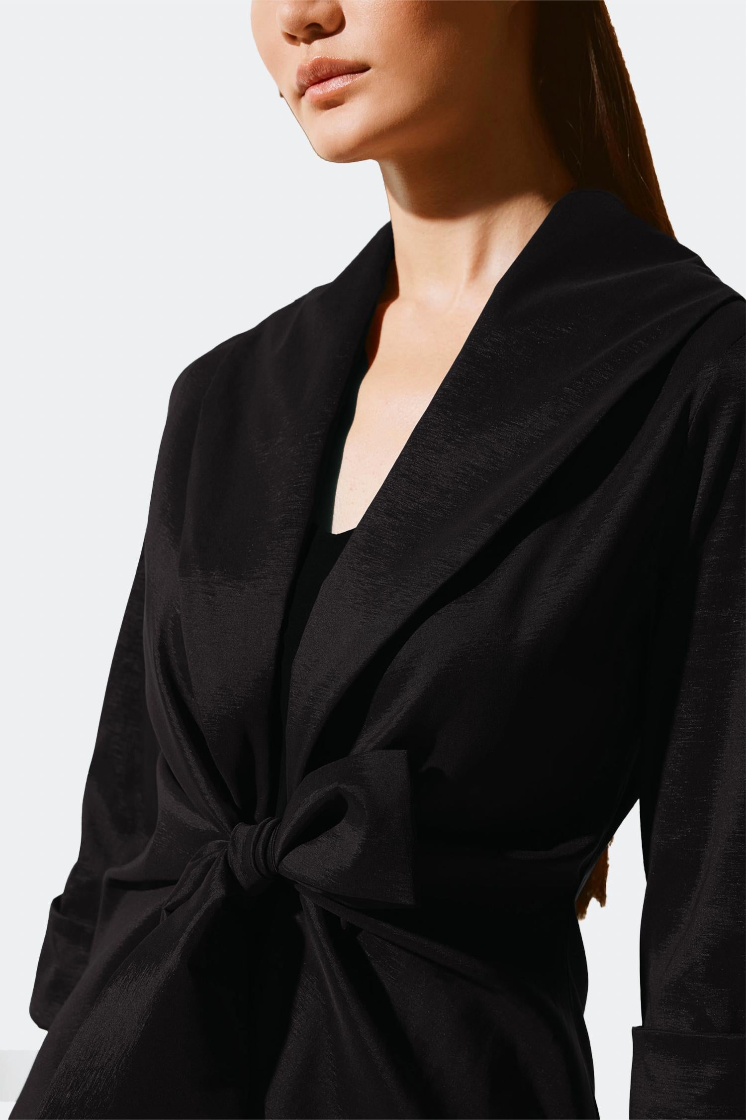 Рукава с манжетами три четверти. Состоит из 68% полиэстера, 25% нейлона и 7% спандекса. Предлагает роскошную эластичную текстуру тафты. С воротником-шалью и завязкой на завязке. Спереди складки по центру и разрезной пояс. Для ухода стирайте вручную в холодной воде и сушите в тени.