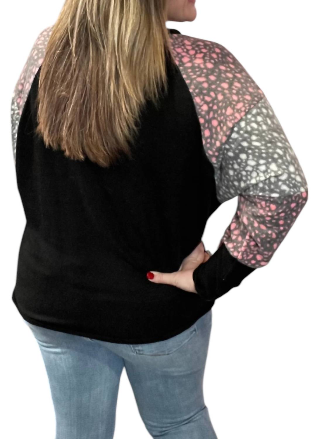 Рукав «летучая мышь». V-образный вырез. Модель надевается через голову. 78% полиэстер, 18% вискоза, 4% спандекс. Машинная стирка в холодной воде.
