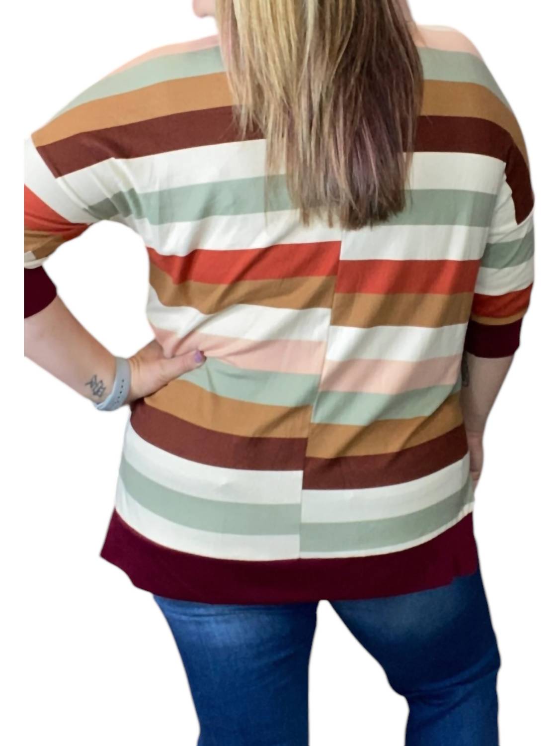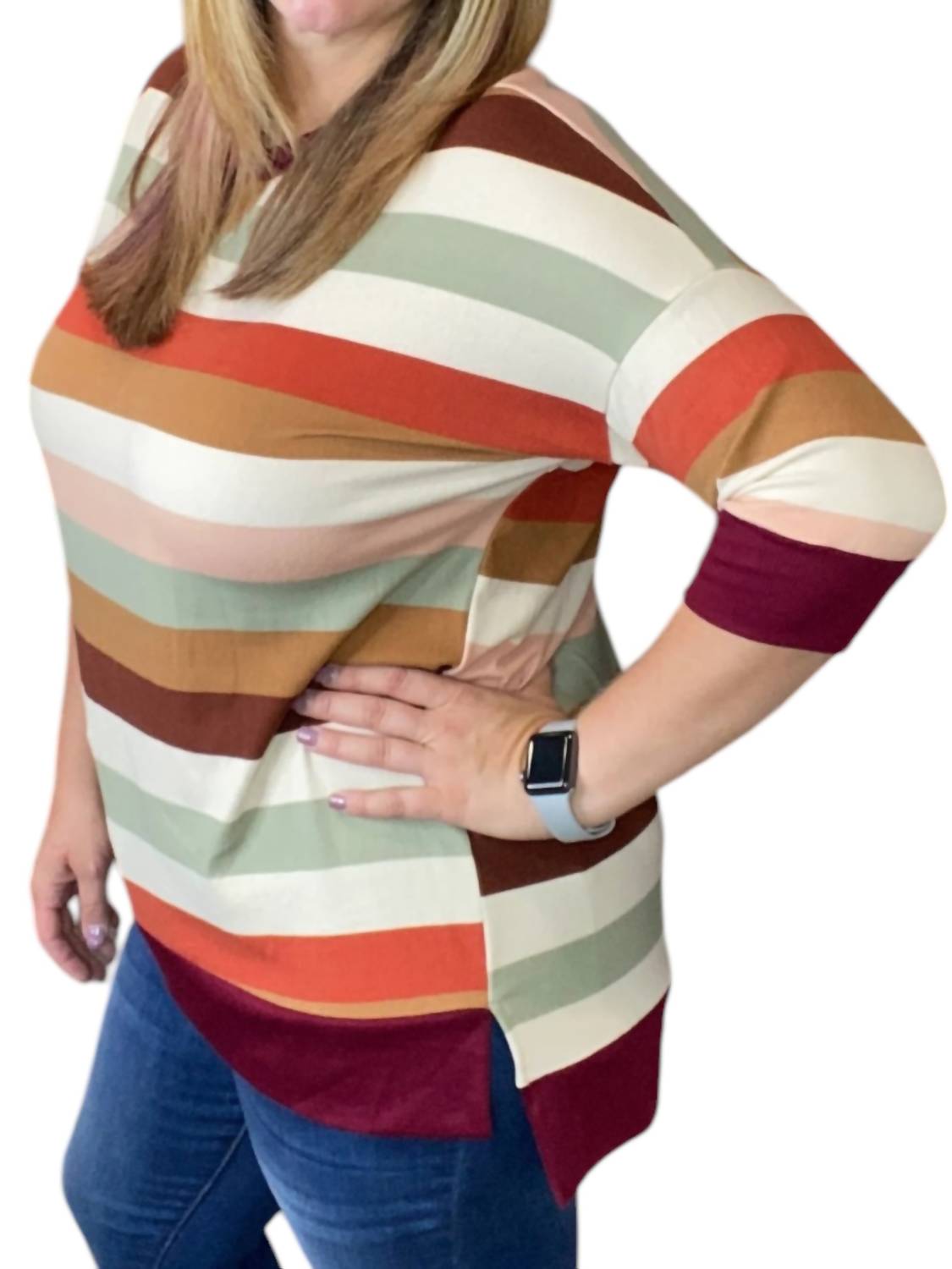 Круглый вырез. Полосатый. Рукава три четверти. Модель в стиле пуловера. Небольшой разрез сбоку с удлиненным подолом сзади. 96% полиэстер 4% спандекс.