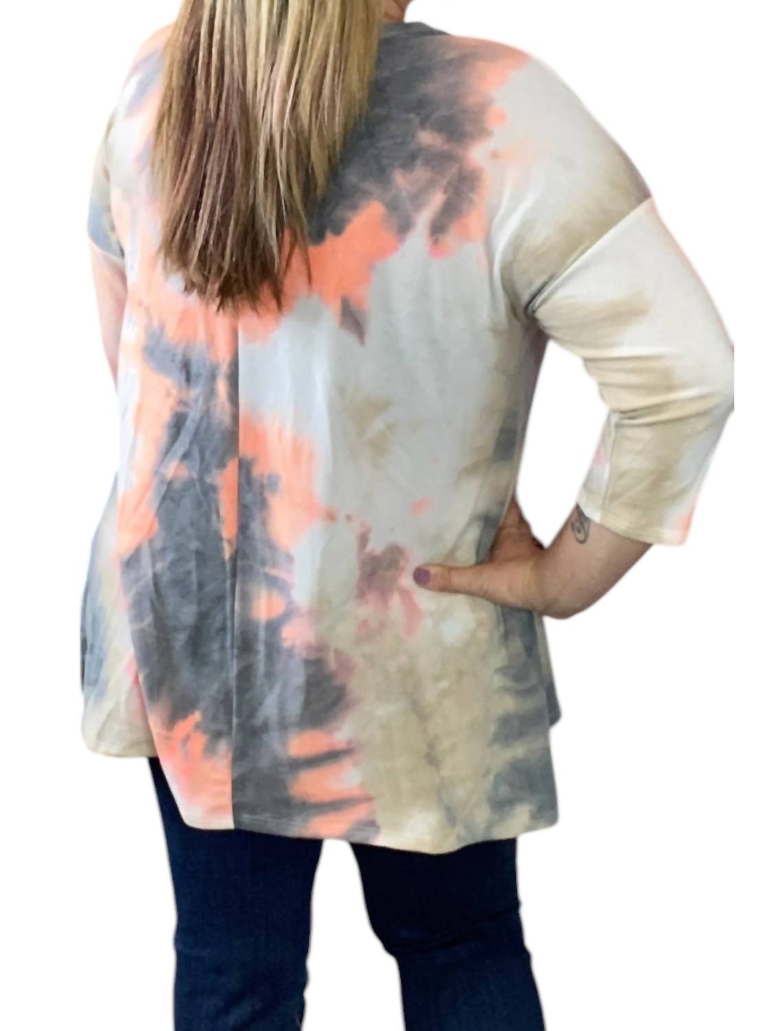 Рукава три четверти. Тай-дай. Овальный вырез. Асимметричный подол. 63% полиэстер, 34% вискоза, 3% спандекс. Машинная стирка в холодной воде.