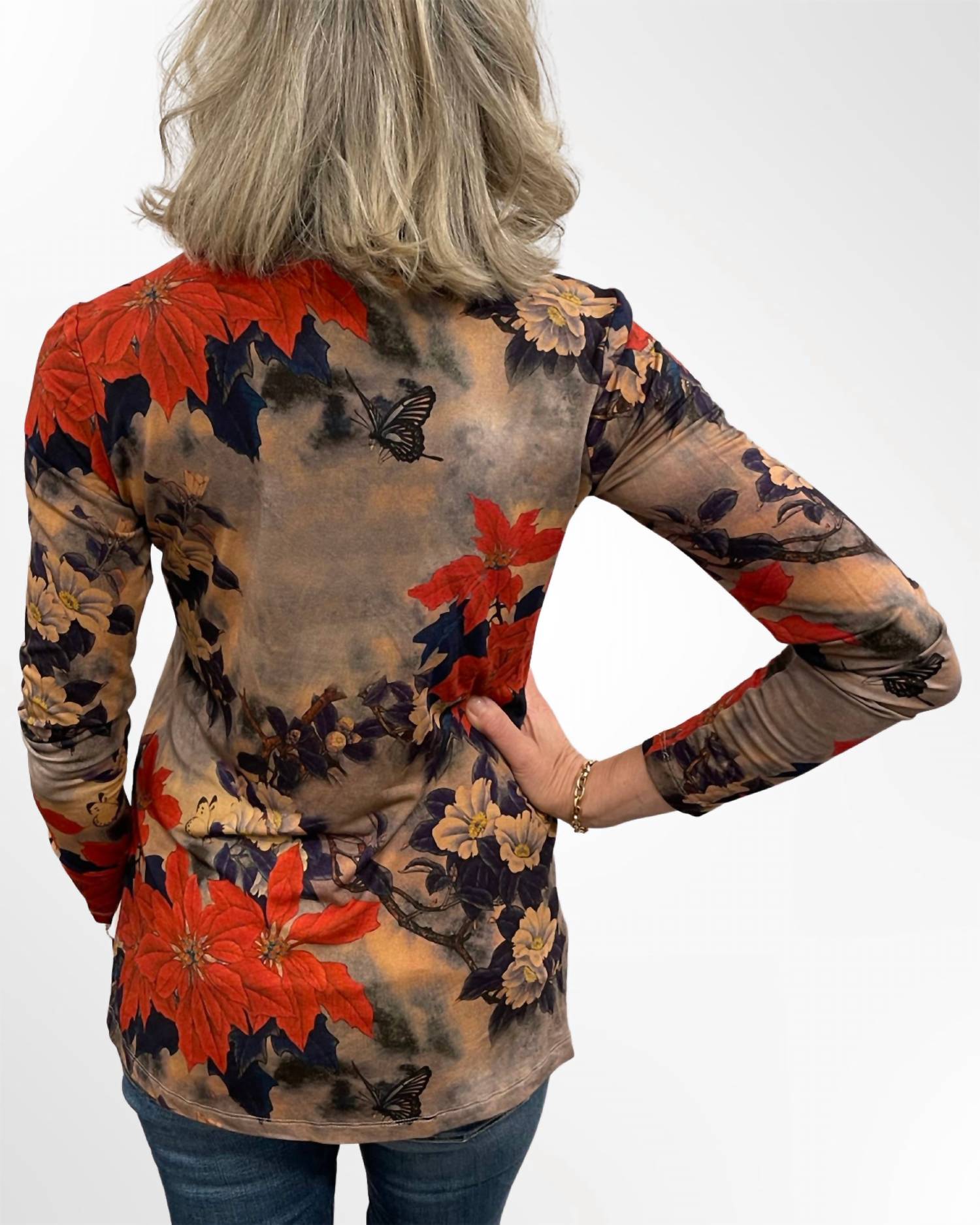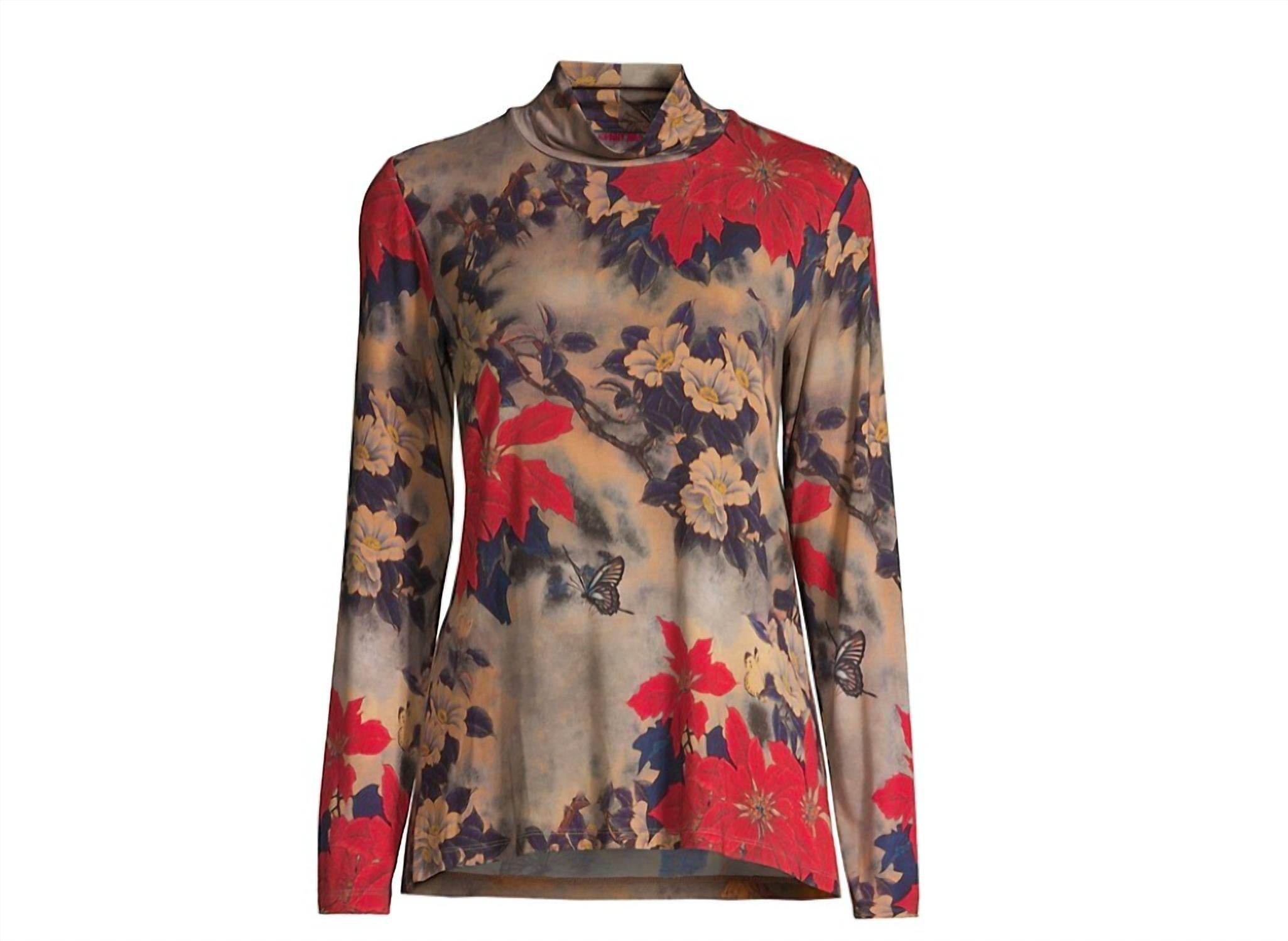 С имитацией водолазки и длинными рукавами. Этот простой в надевании фасон дополнен мягким цветочным принтом. Машинная стирка. Около 26 дюймов от плеча до подола.