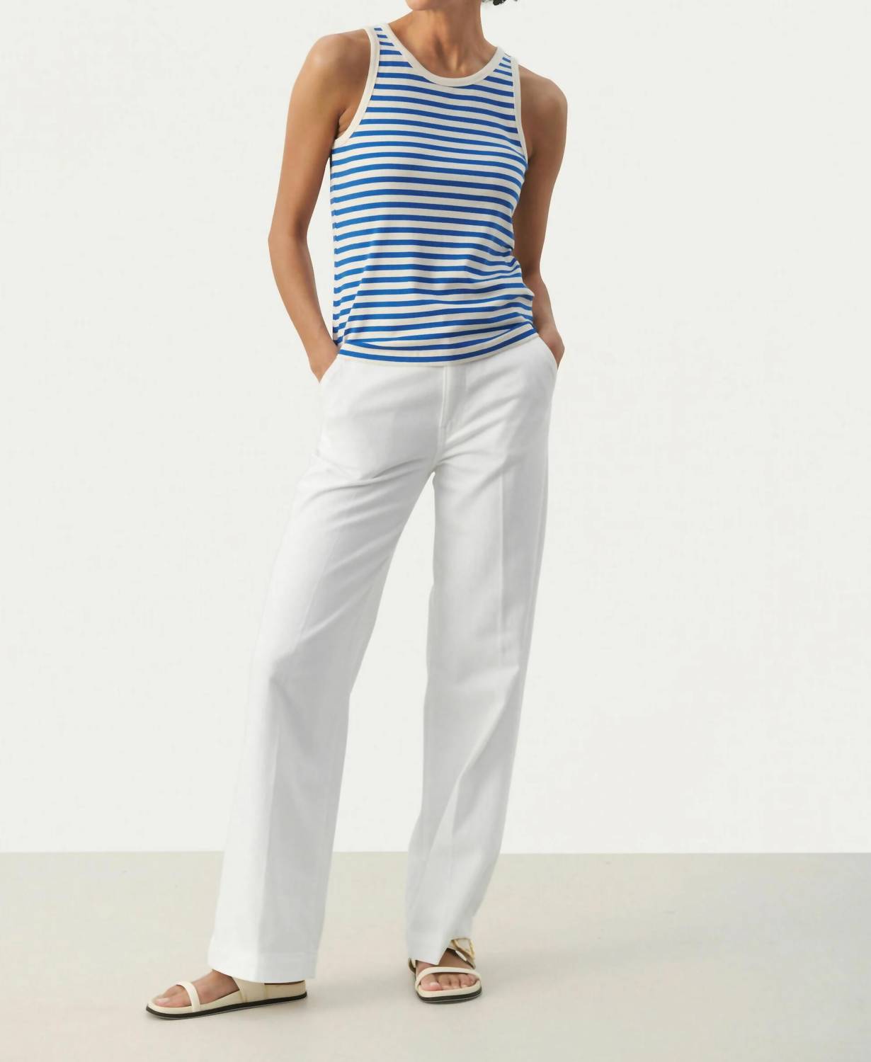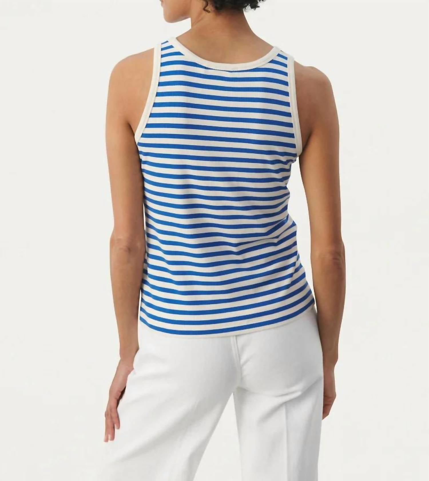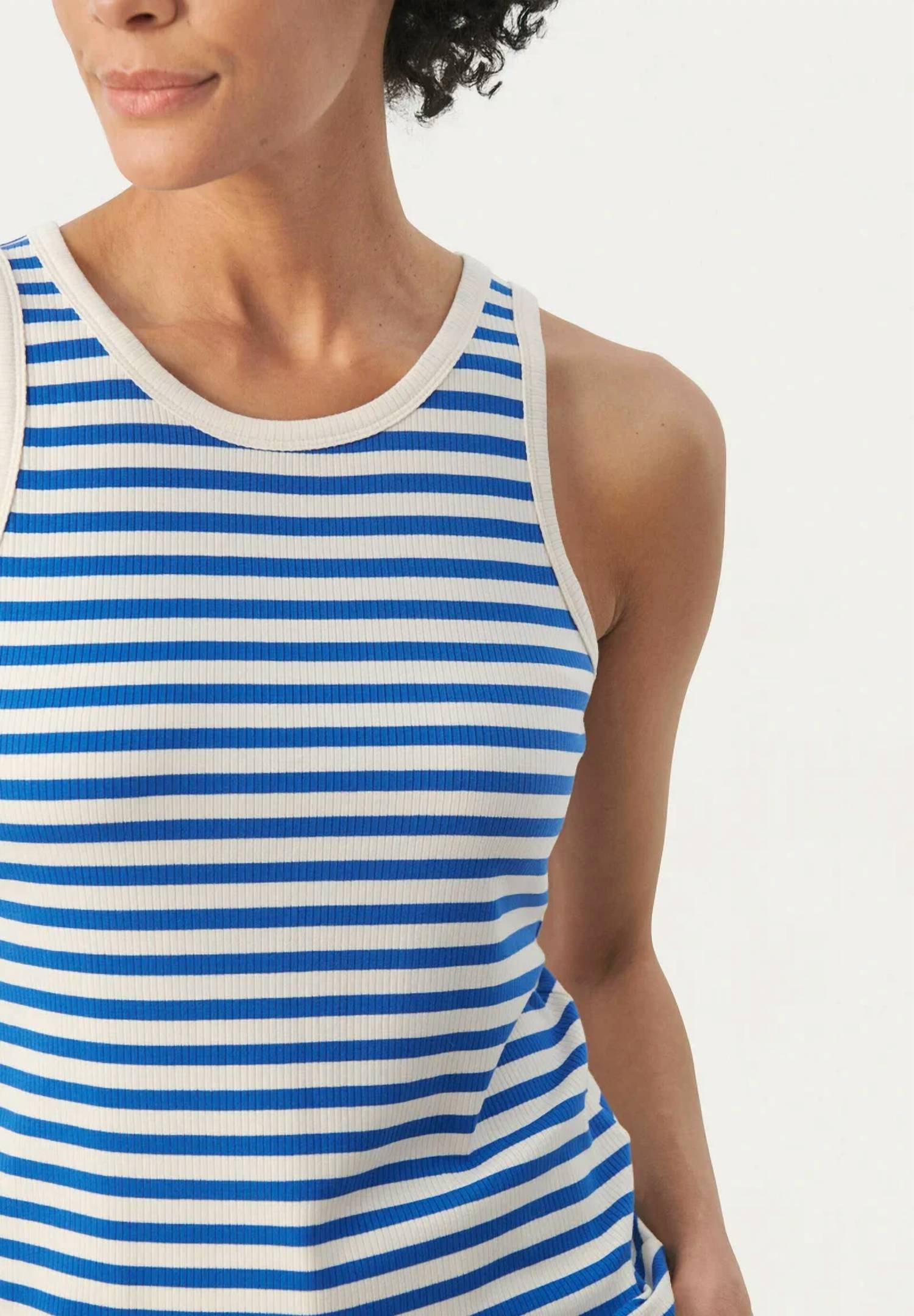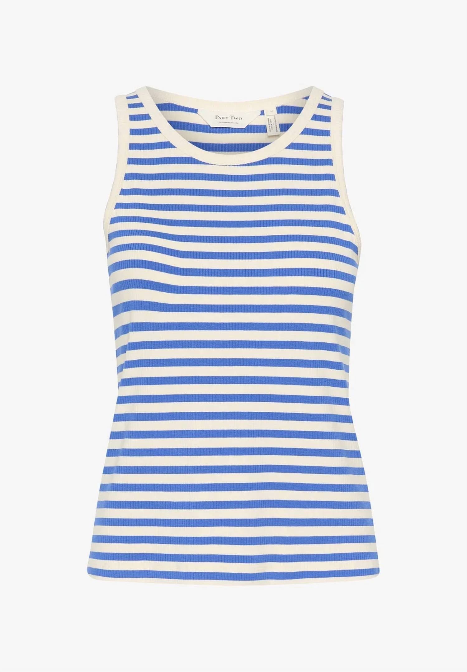Посадка, ткань и функциональность. Эта майка отвечает всем требованиям. Откройте для себя повседневный шик с топом Grecia от Part Two в изысканной синей полоске Nebulas. Эта майка без рукавов имеет привлекательный овальный вырез и изготовлена ​​из смеси 91% вискозы LENZING ECOVERO и 9% эластана для удобной и стандартной посадки. Созданная для легкого надевания, она воплощает в себе вневременной стиль с классическим полосатым узором. Ухаживайте за топом легко, так как его можно стирать в стиральной машине.