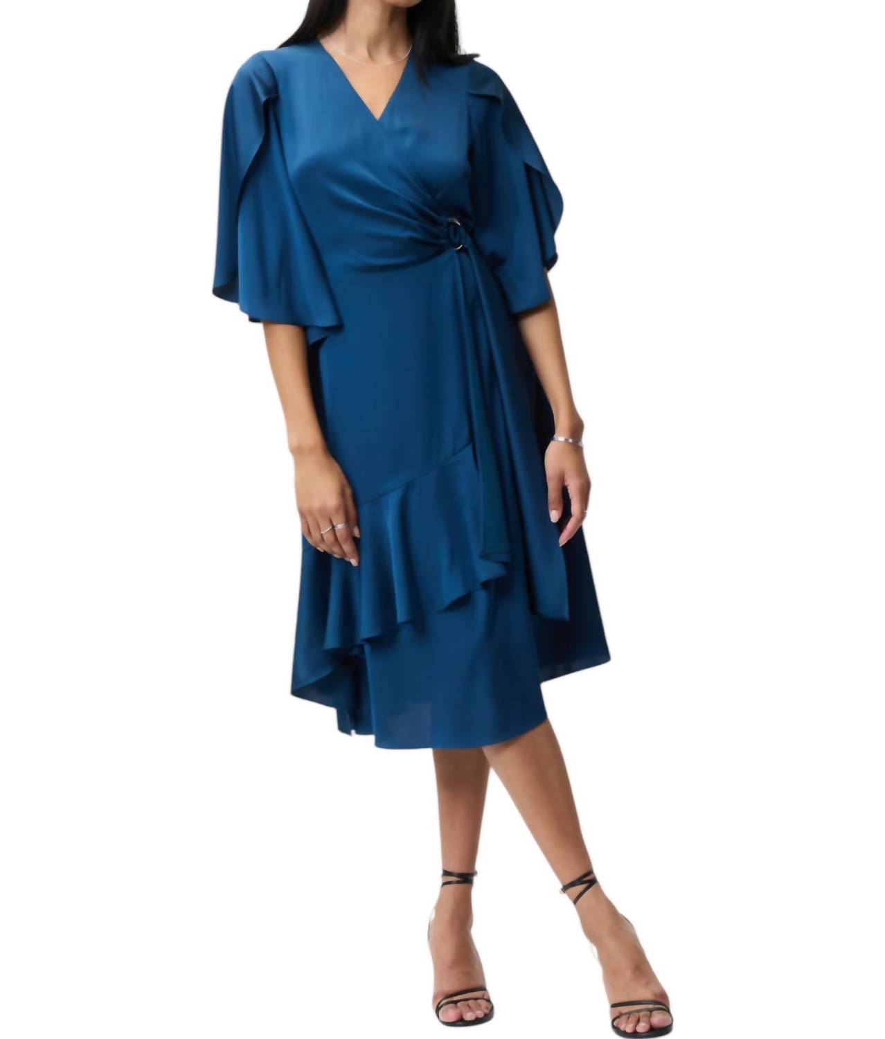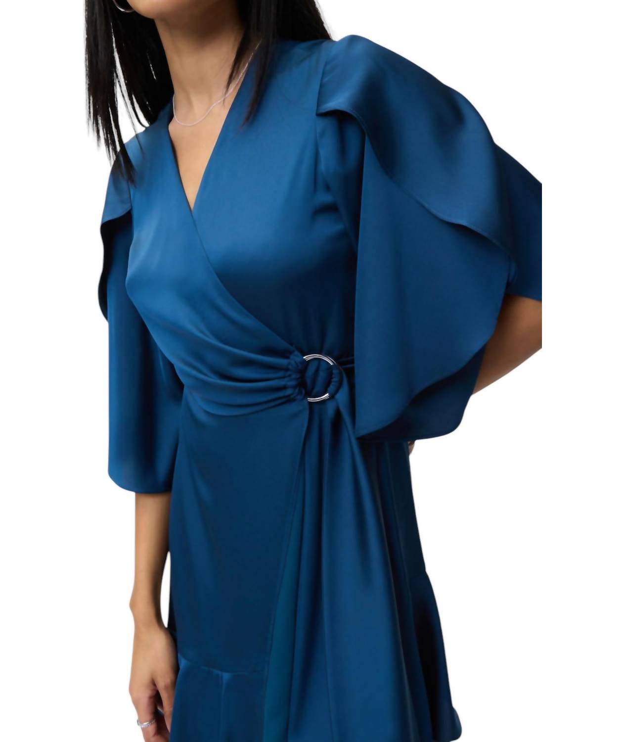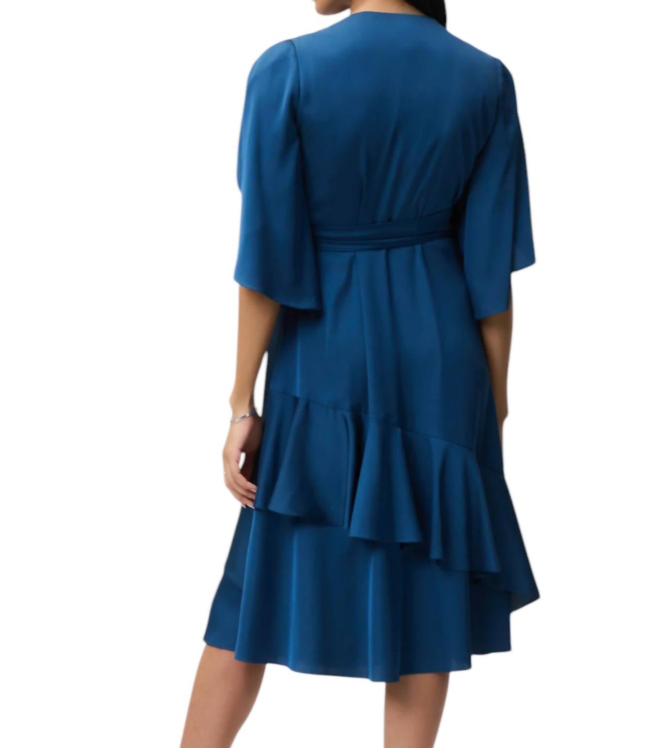 Элегантное платье от Joseph Ribkoff с развевающимися рукавами. Асимметричный оборчатый подол для динамичного завершения. Мягко обхватывает талию для выгодной посадки. Эластичный пояс для удобства и легкости. Без карманов и молнии для гладкого силуэта.
