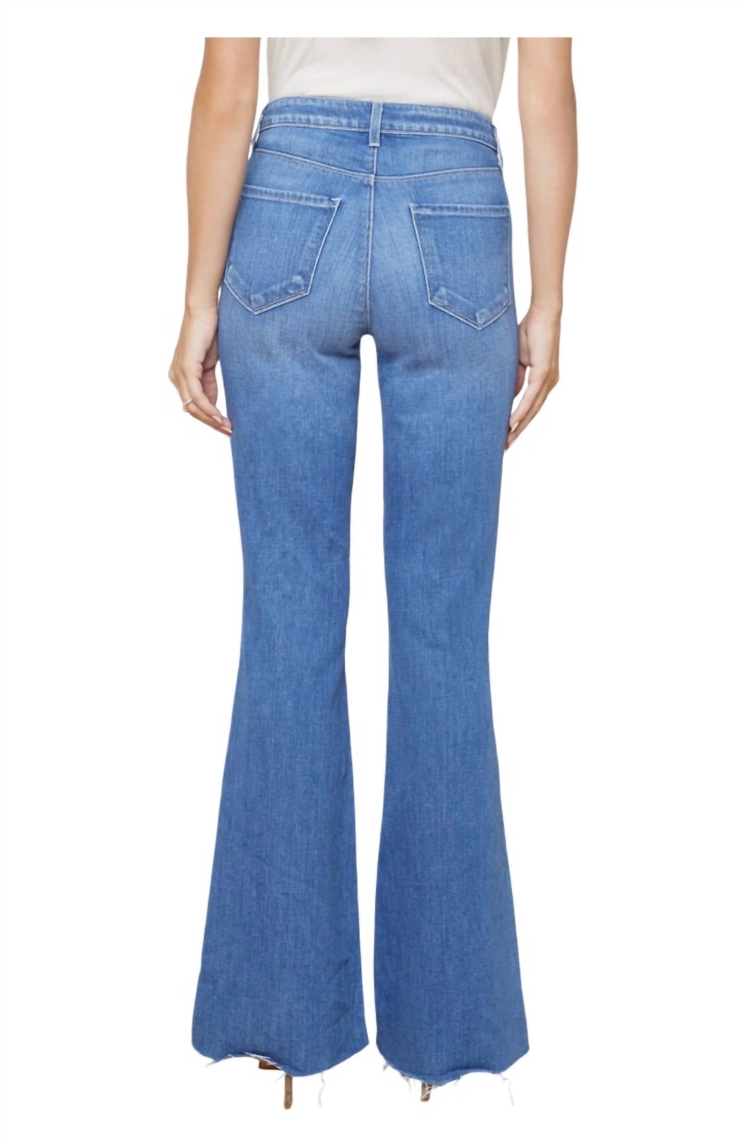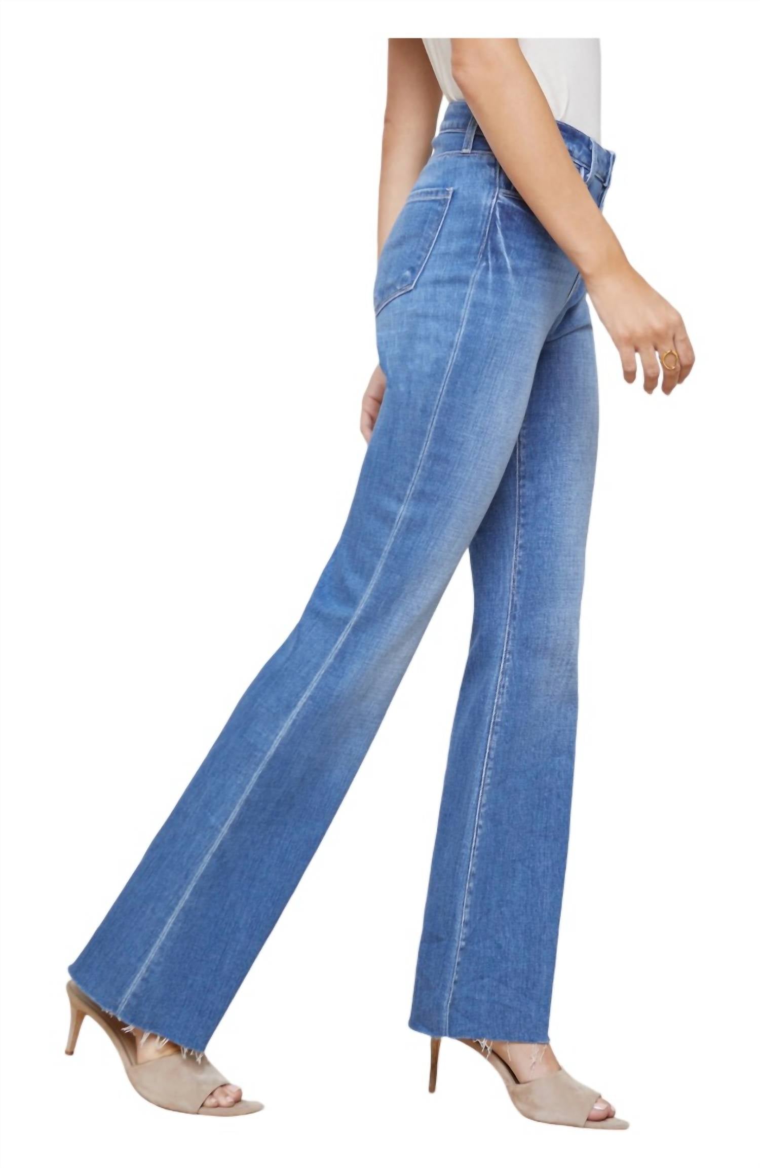 Расклешенный силуэт. Контурный пояс. Эластичный деним премиум-класса средне-синего цвета. Классическая конструкция с пятью карманами. Застежка-молния. Размеры: посадка — 9,5", длина внутреннего шва — 32", длина брючины — 22". Соответствует размеру. 94% хлопок, 5% полиэстер, 1% спандекс.