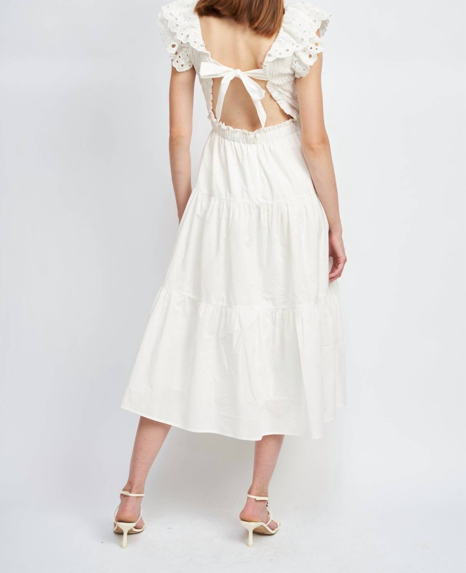 Платье миди настолько универсально, что ваши варианты ношения безграничны. Рукава-крылышки с оборками. V-образный вырез. Присборенный. Завязки на спине. Многоярусная юбка. Ткань - 100% хлопок. Подкладка - 100% хлопок. Ручная стирка. Модель ростом 5 футов 9 дюймов носит размер Small.