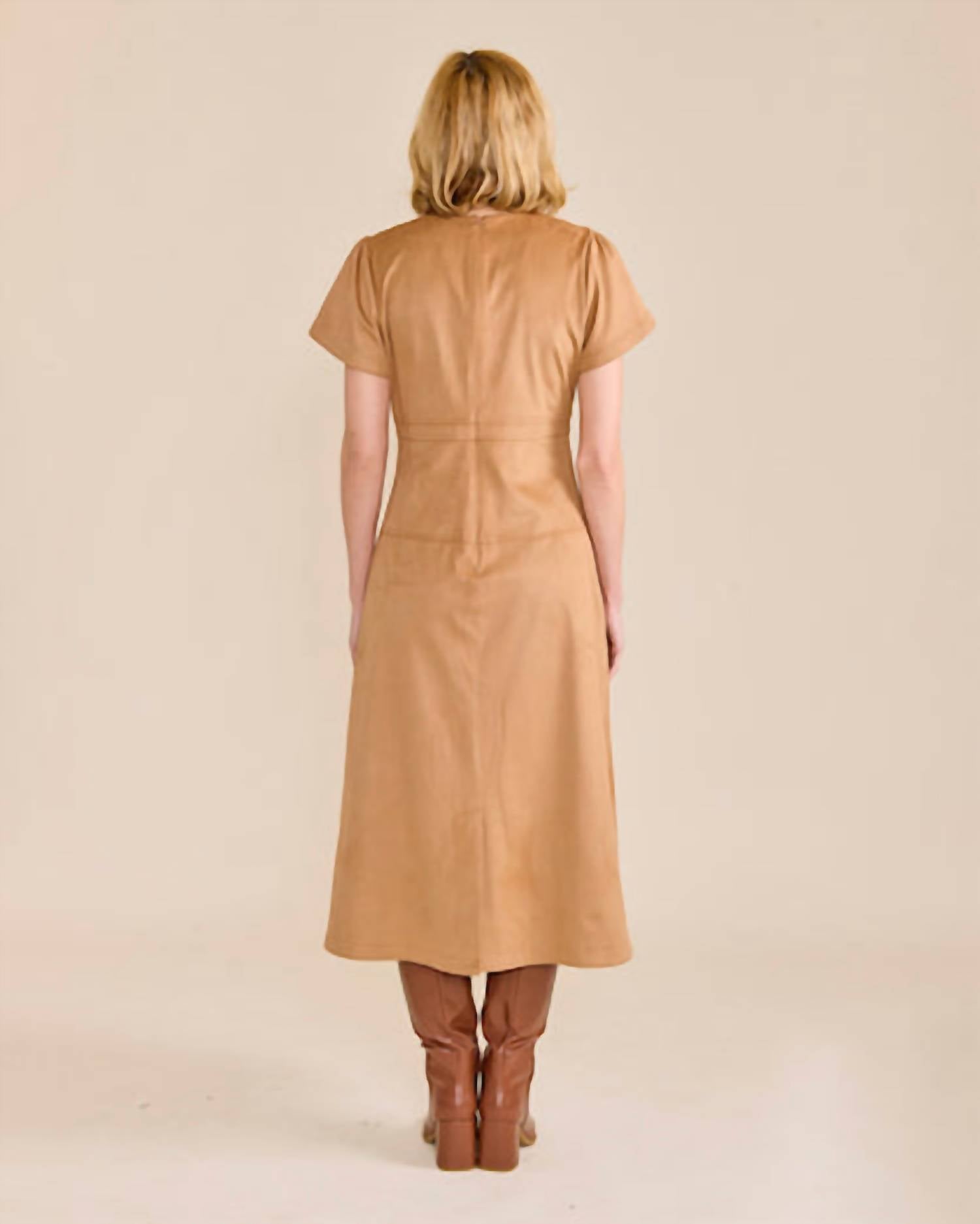Это платье миди-длины, размером 46 дюймов, имеет привлекательный V-образный вырез и ампирную талию, изготовлено из смеси 90% полиэстера и 10% спандекса с мягкой текстурой искусственной замши. Его короткие рукава и микрополоски добавляют изящную деталь, а застежка-молния сзади обеспечивает идеальную посадку.