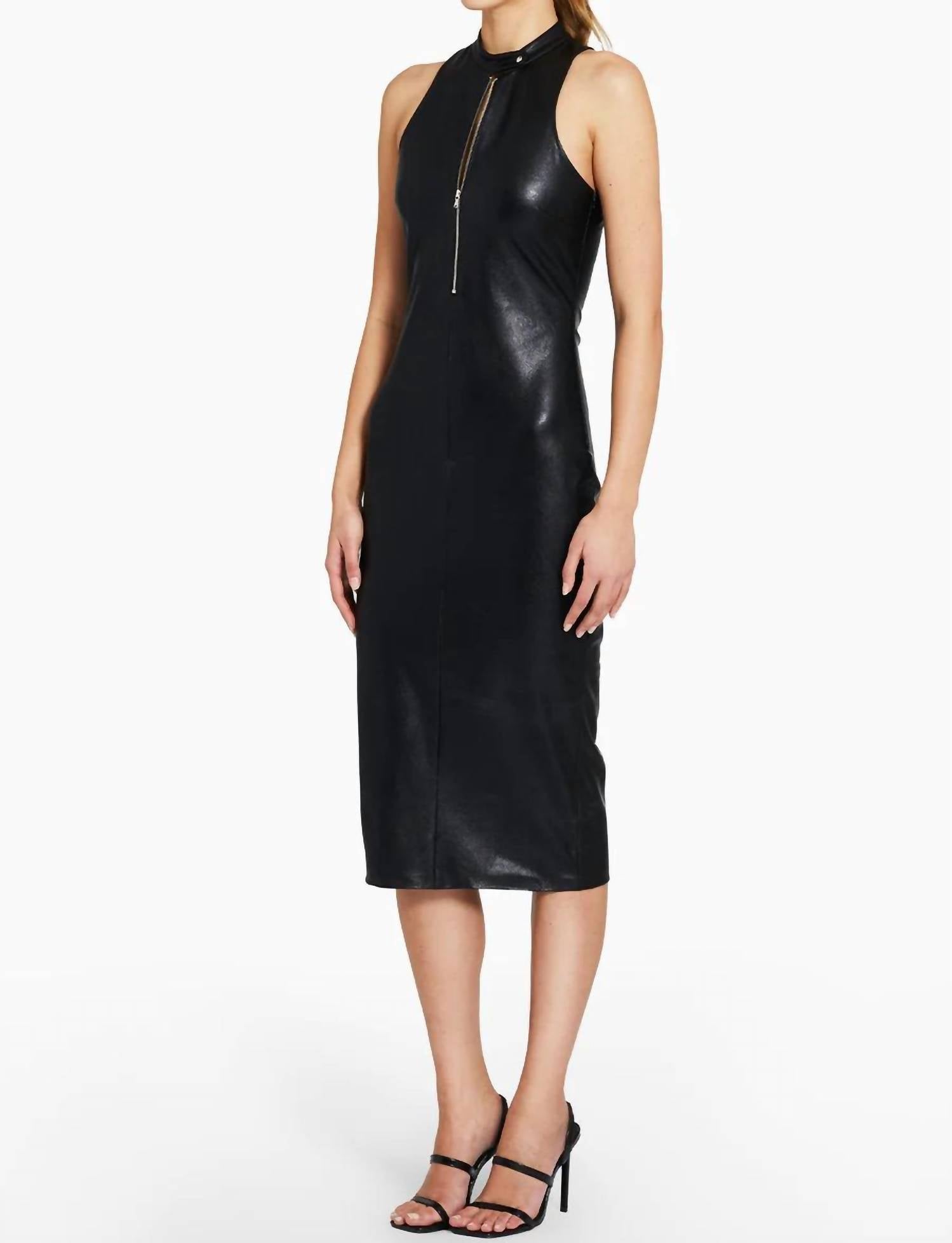 Платье в байкерском стиле. Без рукавов. Потайная молния. Без подкладки. Состав: 55% вискоза, 45% полиуретан. Подкладка: 100% полиэстер. Сухая чистка любым растворителем, кроме трихлорэтилена.