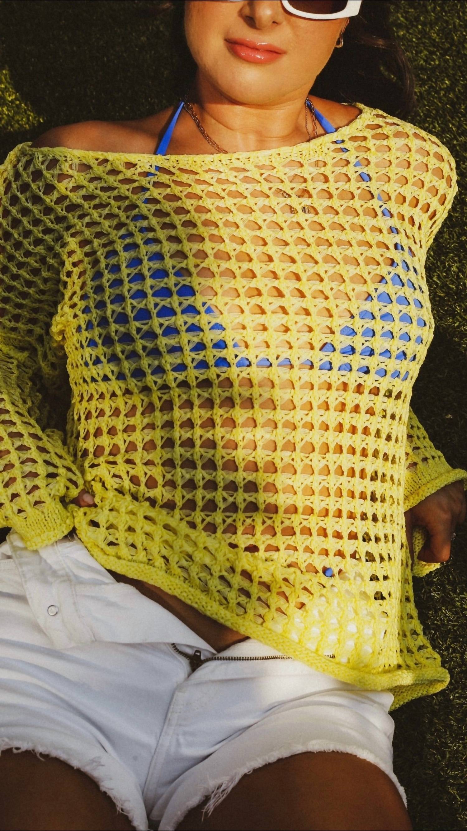 Эта пляжная накидка крючком имеет вид oversize, длинные рукава, вырез-лодочка и асимметричный подол. Она прозрачная и надевается.