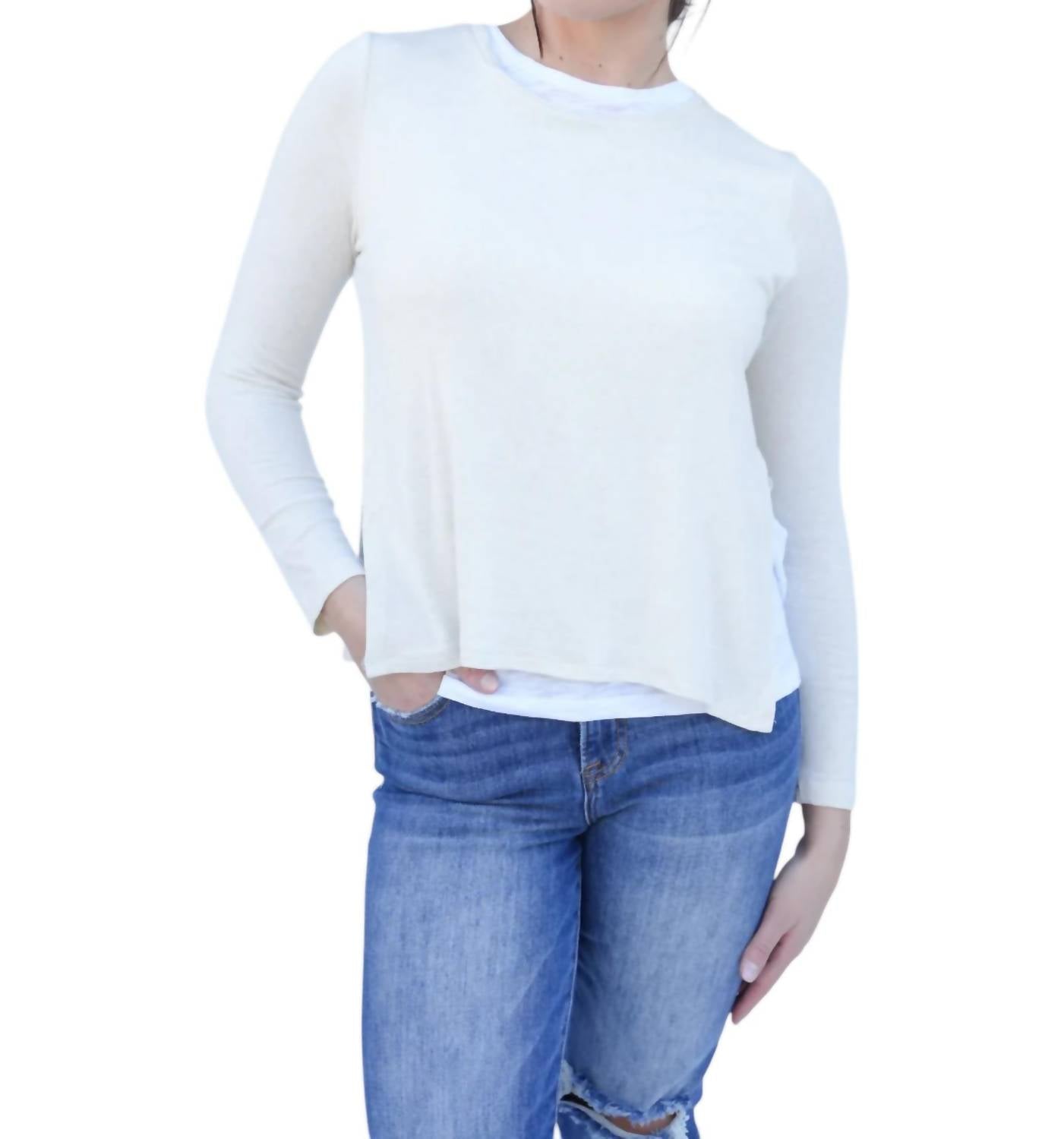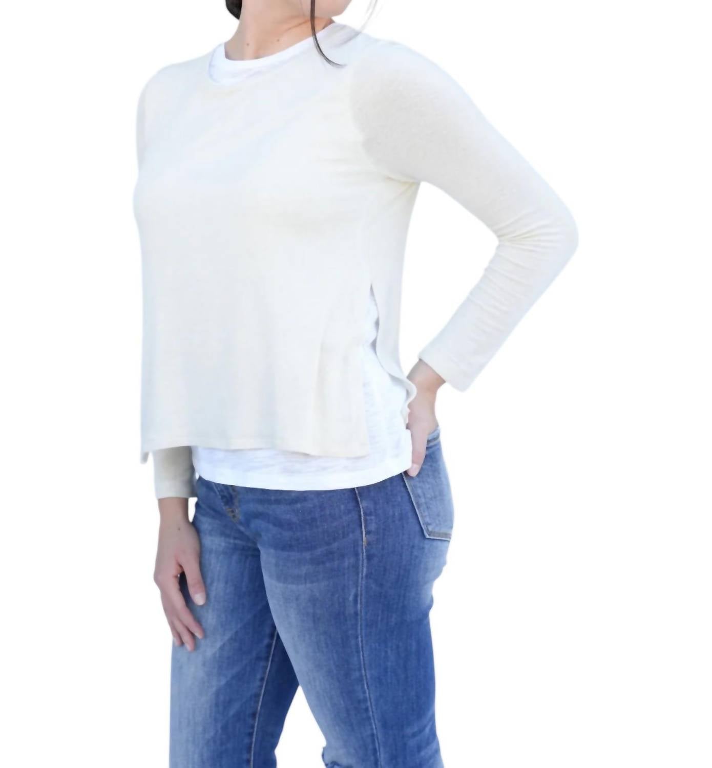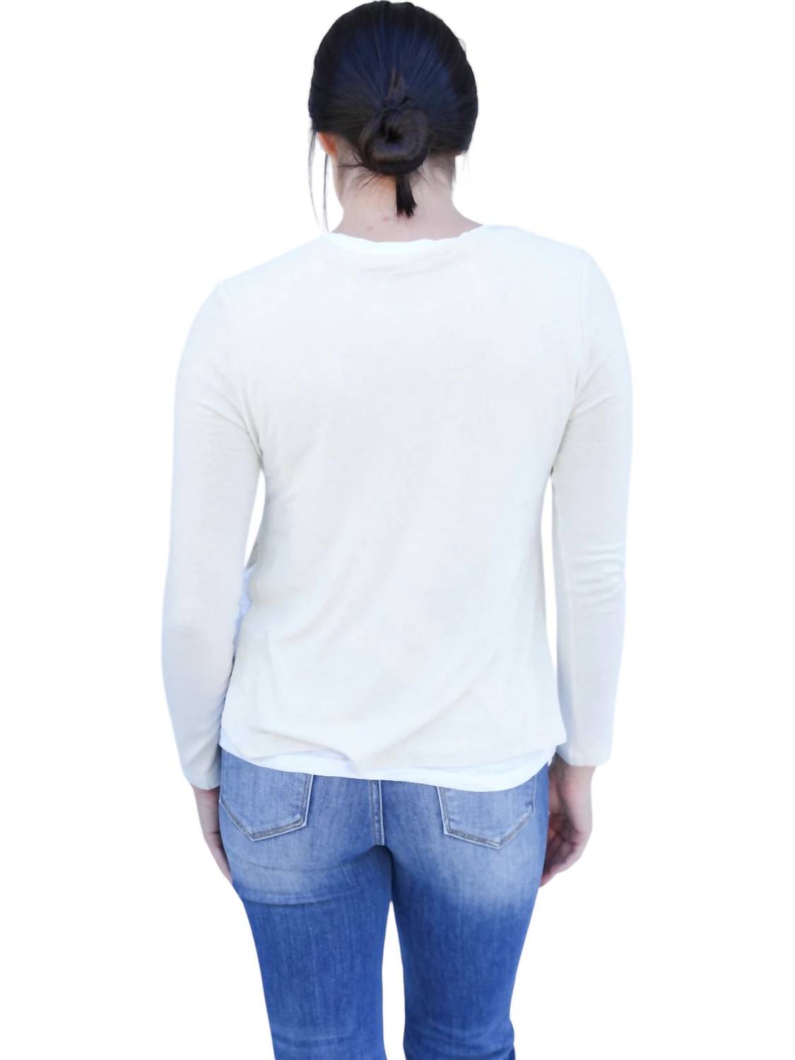 Футболка с длинными рукавами. Многослойный вид. Боковые разрезы. Однотонный белый дизайн. Круглый вырез. 81% вискоза, 15% шерсть, 4% спандекс. Идеальный размер. Застежка-липучка. Удобная и стильная.