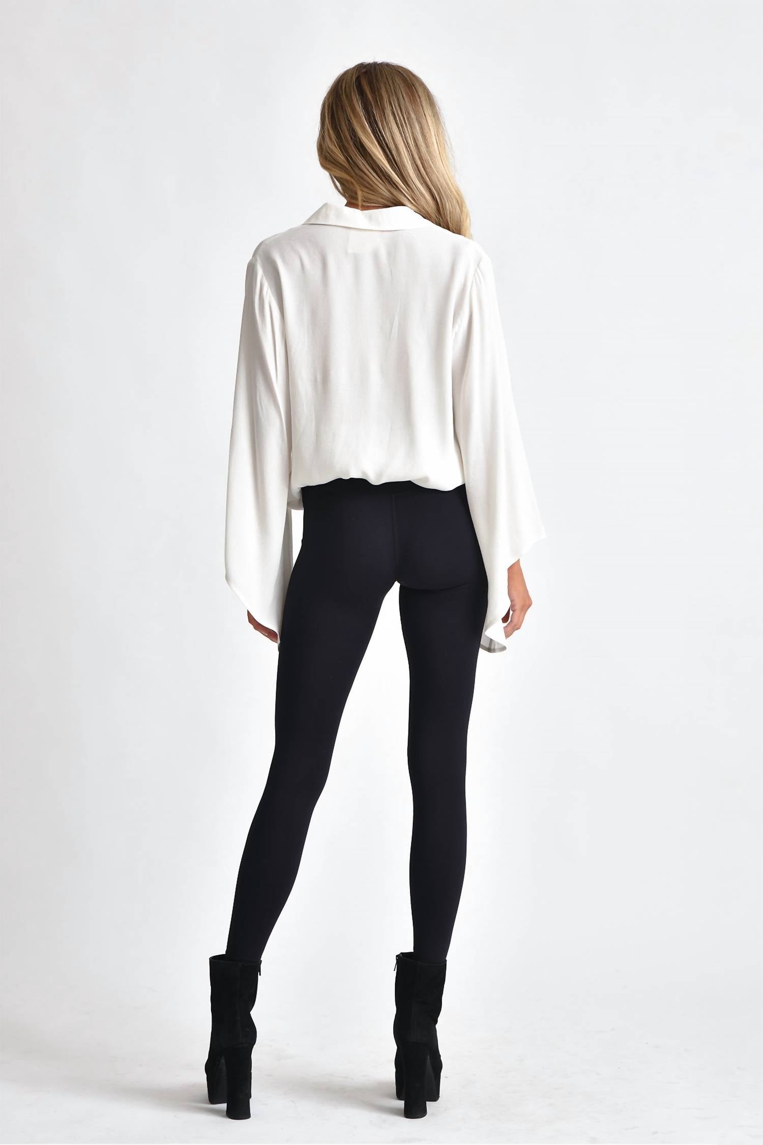Универсальная блузка, которая подойдет и для работы, и для ужина! Шикарный силуэт с длинными расклешенными рукавами, V-образным вырезом с высоким воротником и эластичной талией. Ткань - 100% полиэстер.