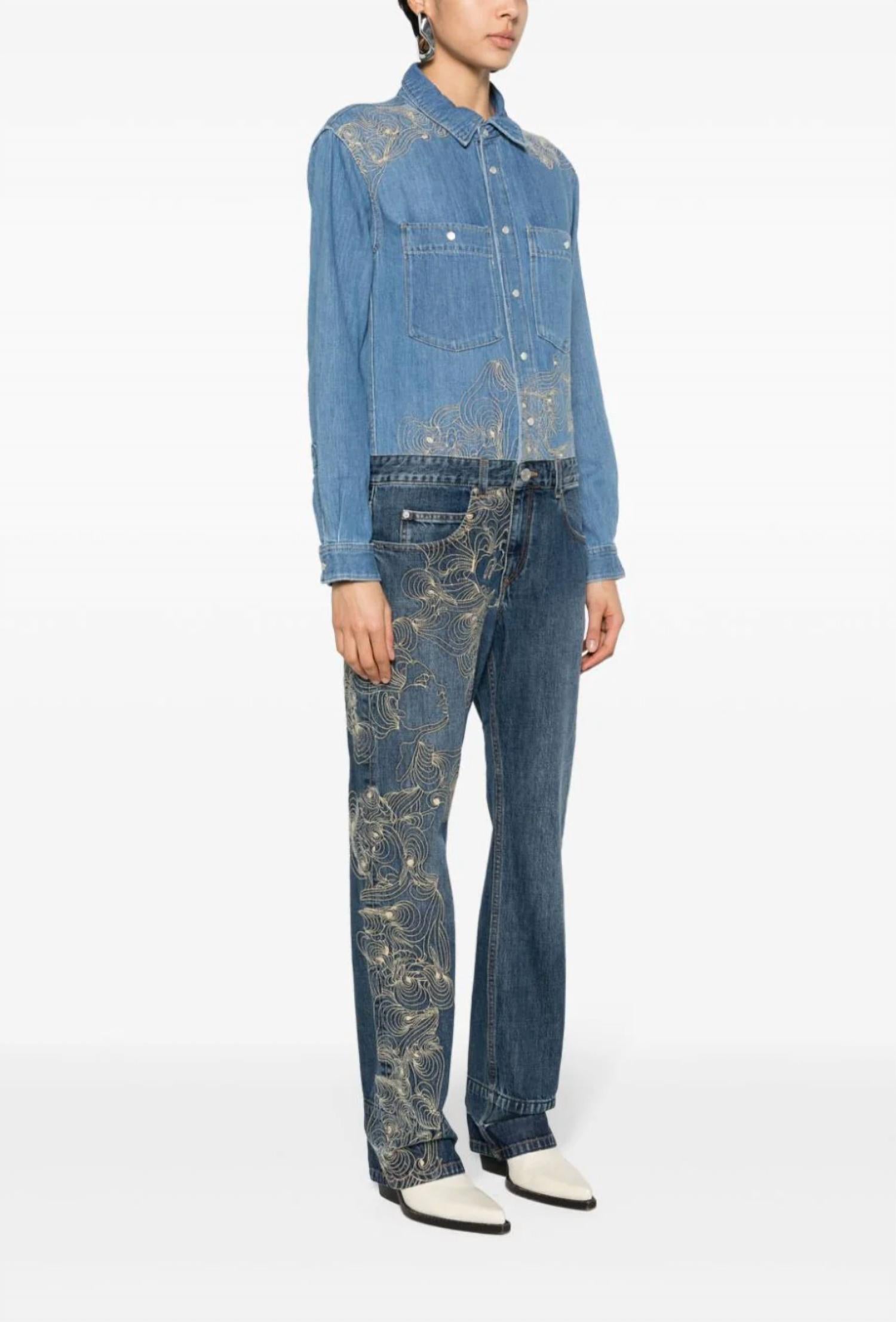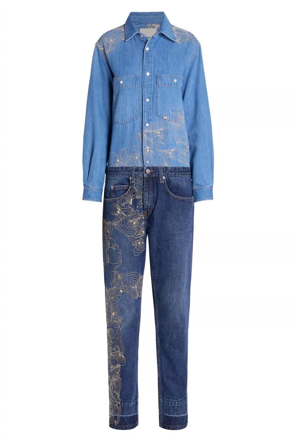 Джинсовый комбинезон с длинными рукавами. Вышитые детали. Двухцветный деним. Прямой крой. Отворот. Нагрудные и боковые карманы. Застежка на пуговицы спереди. Манжеты на пуговицы. Частичная подкладка. 100% хлопок. Эта модель соответствует размеру, берите свой обычный размер.