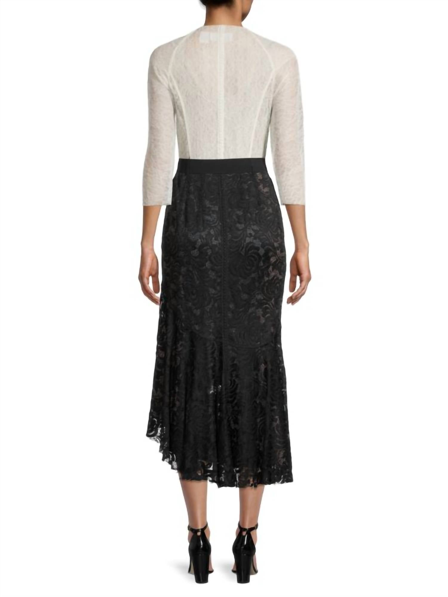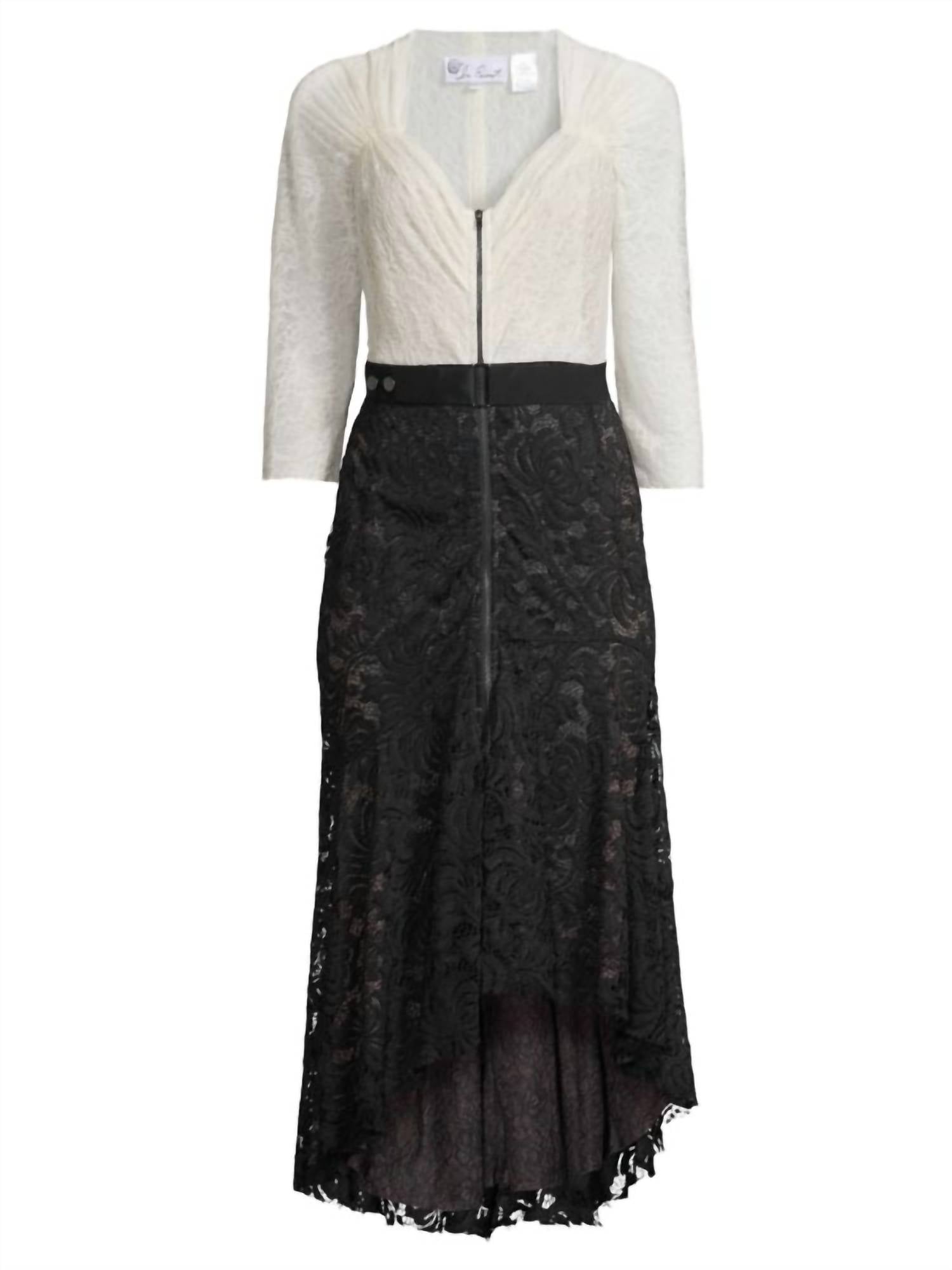 Платье идеальной длины существует. Двухцветное кружевное платье. Присборено на линии горловины. Подчеркнуто открытой молнией спереди и смелым съемным поясом. Вырез в форме сердечка. Рукава три четверти. На подкладке. Примерно 41-51 дюйм от плеча до подола. Химчистка. Изготовлено из нейлона и спандекса.