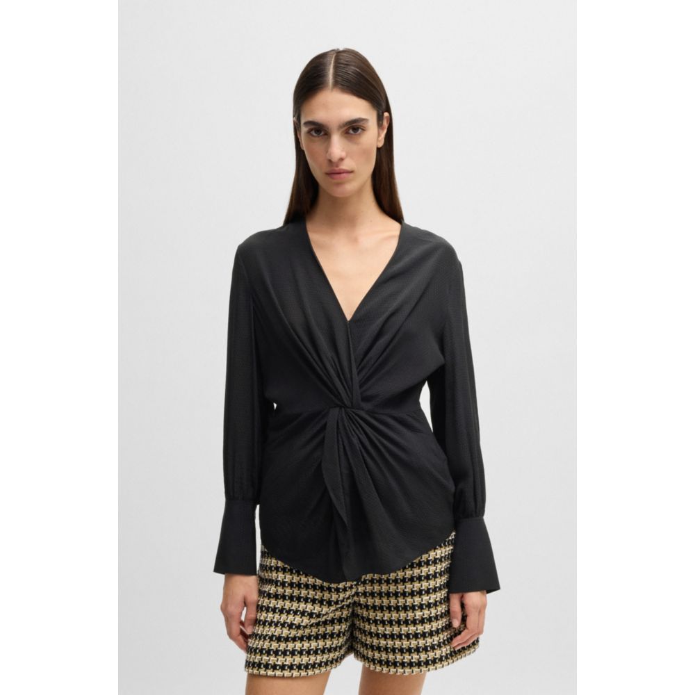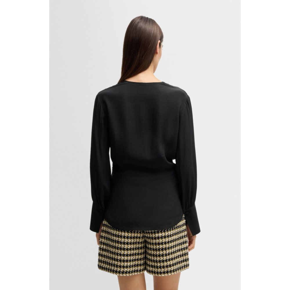 Переосмысленная блузка из шелка от BOSS Womenswear. Этот топ с V-образным вырезом спереди имеет стандартный крой и удлиненные манжеты.
