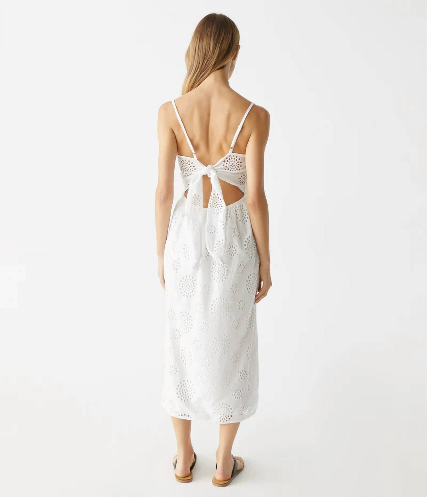 Платье идеальной длины существует. Имеет регулируемые бретели и завязывающийся сзади лиф. Платье без рукавов, миди-платье с квадратным вырезом и ажурной отделкой, которая находится на подкладке в теле и юбке. Вышитая ажурная отделка - 100% хлопок. Машинная стирка. Модель ростом 5 футов 9 дюймов носит размер Small. Длина - 47 дюймов.